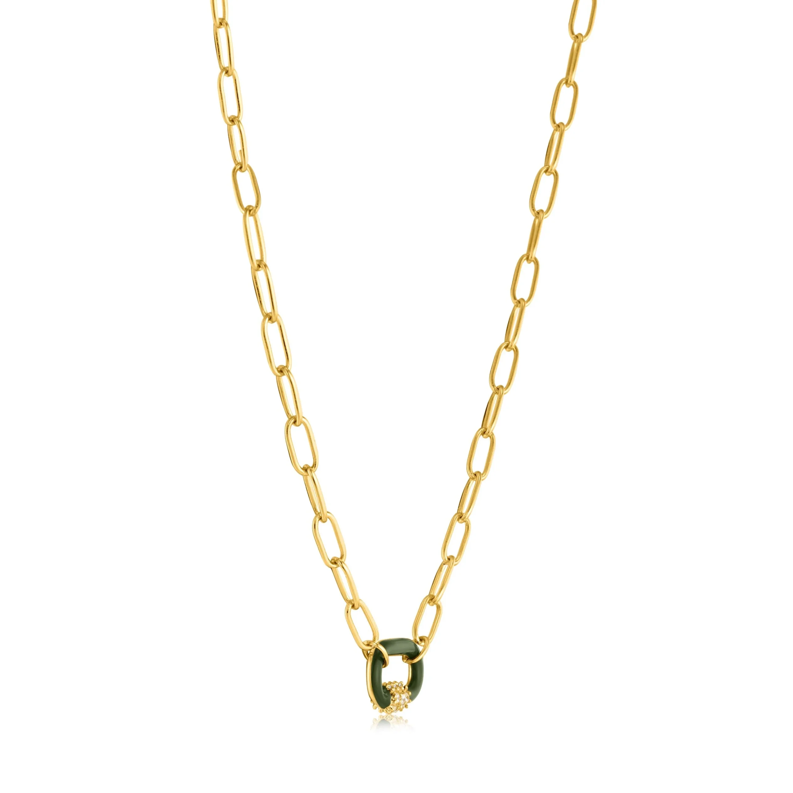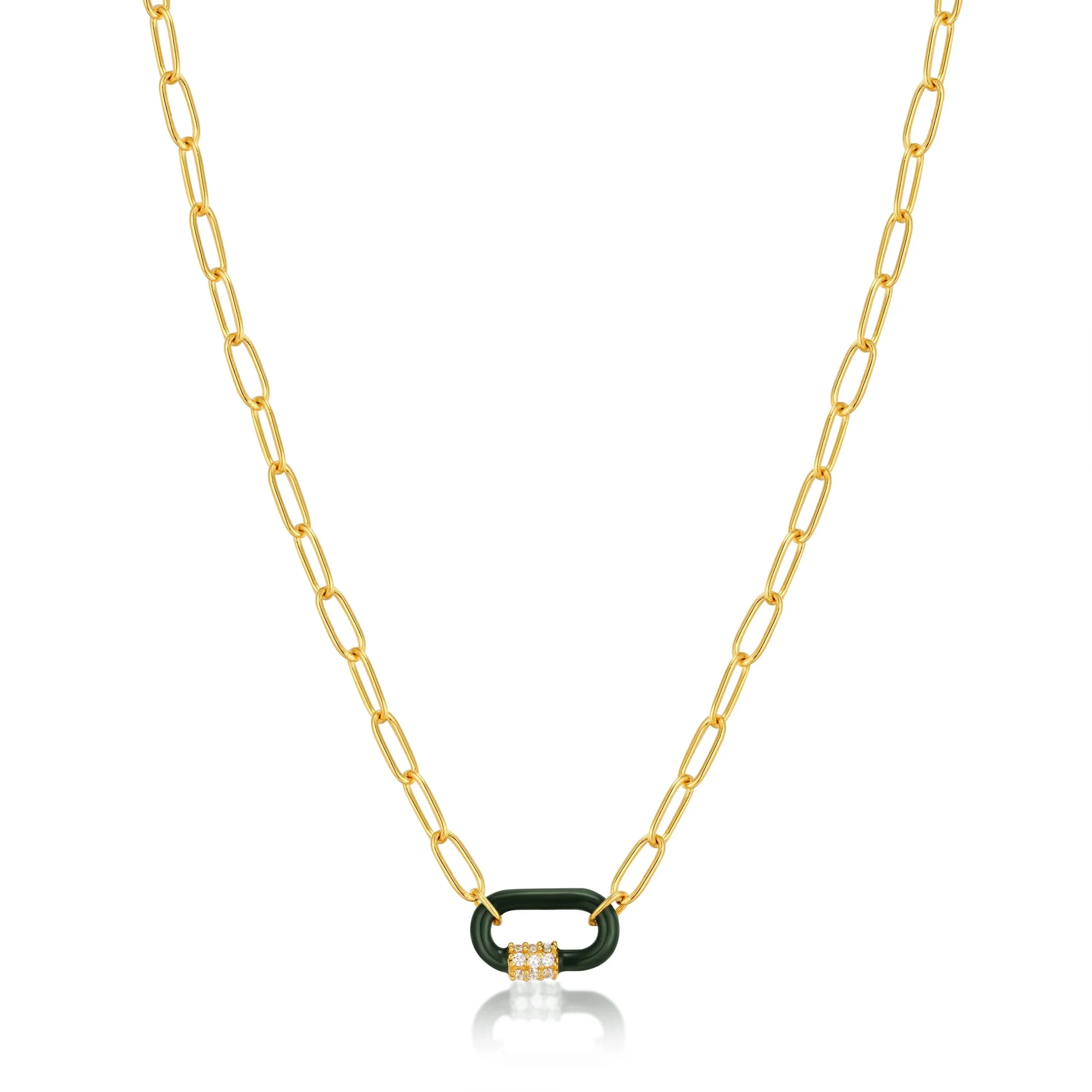 This Ania Haie Forest Green Enamel Carabiner Gold Necklace captures modern elegance with a striking carabiner pendant finely finished in forest green enamel. Crafted in 14kt gold plated sterling silver for enduring beauty, the necklace radiates sophistication while offering adjustable comfort with its thoughtful design. Measuring 400mm with a 50mm extender, it rests gracefully on the neckline, drawing attention with its subtle 7mm pendant. A perfect statement piece from the Bright Future collection, this necklace blends timeless luxury and contemporary charm, making it an ideal choice for elevating any jewelry collection or gifting on special occasions.