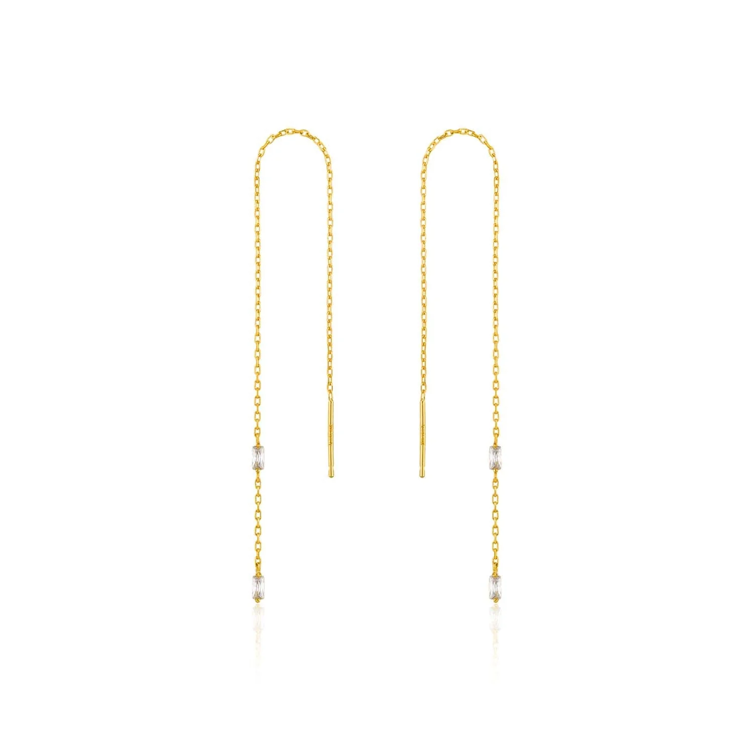 The Ania Haie Glow Threader Earrings capture modern sophistication with their 925 sterling silver base finished in radiant 14kt gold plating. Designed for effortless elegance, each earring features a delicate chain accented with sparkling baguette-cut cubic zirconia, offering a refined yet on-trend look. The adjustable 12.5cm length allows for personalized styling, making them a versatile addition to any jewelry collection. These threader earrings are perfect for elevating everyday ensembles or highlighting evening attire, embodying the signature craftsmanship and contemporary appeal that define Ania Haie’s celebrated Glow Getter collection.