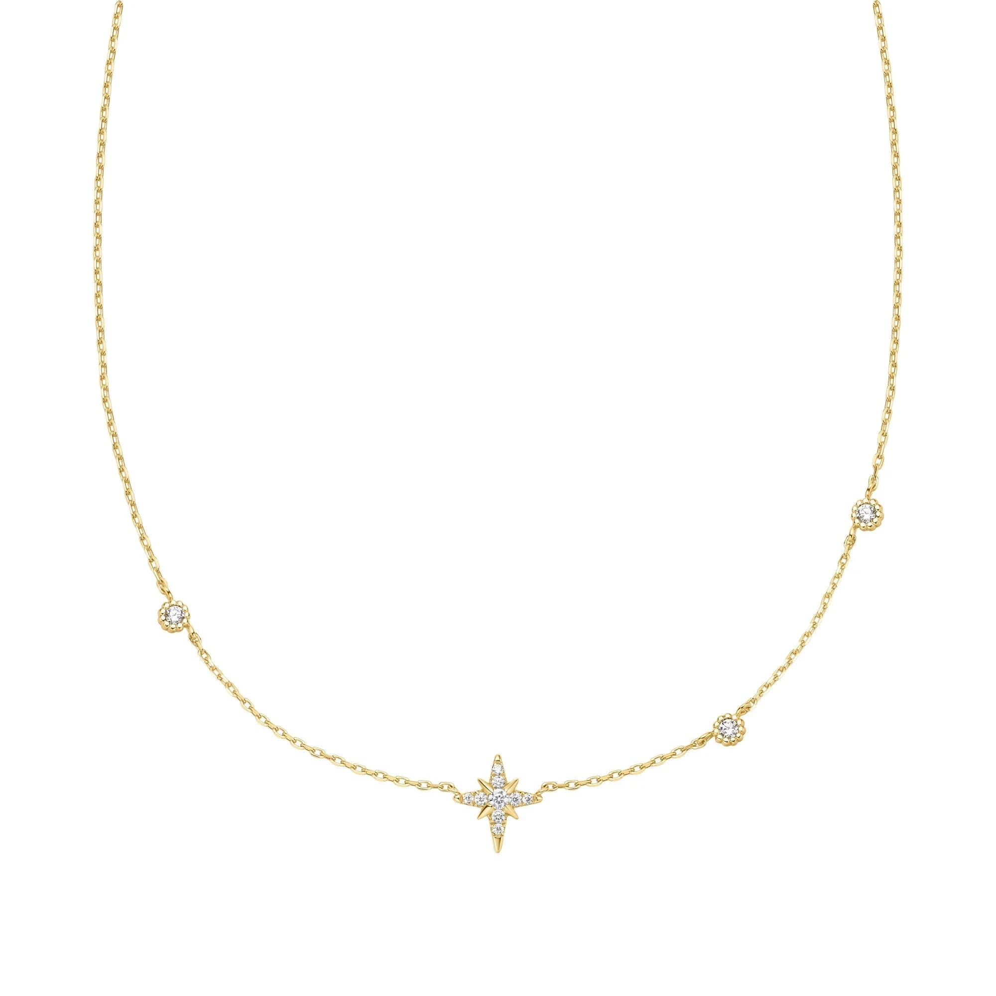 This Ania Haie Gold Eight-Pointed Star Cubic Zirconia Station Necklace features a refined gold finish over 925 sterling silver, highlighted by a series of eight-pointed star charms and delicate cubic zirconia accents. The modern, minimalist design embodies the luxurious yet accessible reputation of Ania Haie, adding subtle brilliance with every movement. Perfect for layering or as a striking standalone piece, this necklace blends classic inspirations with a fresh twist, elevating any contemporary jewelry collection with its elegant charm and versatile styling.