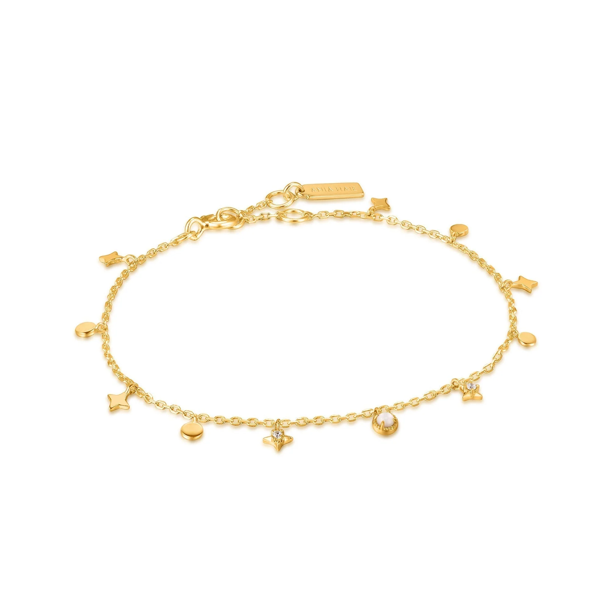 Elevate your look with the Ania Haie Gold Star Mother of Pearl Drop Anklet, a refined jewelry piece crafted from 14kt gold-plated sterling silver. Showcasing delicate charms and a lustrous mother of pearl accent, this anklet embraces elegance while maintaining a modern, trend-setting appeal. Its light 2g weight ensures comfort for everyday wear, while the adjustable 230mm length with a 25mm extender offers a custom fit. Perfect for adding a touch of sophistication, this women’s anklet from the renowned Ania Haie collection resonates with enduring style and the luxury of fine craftsmanship.