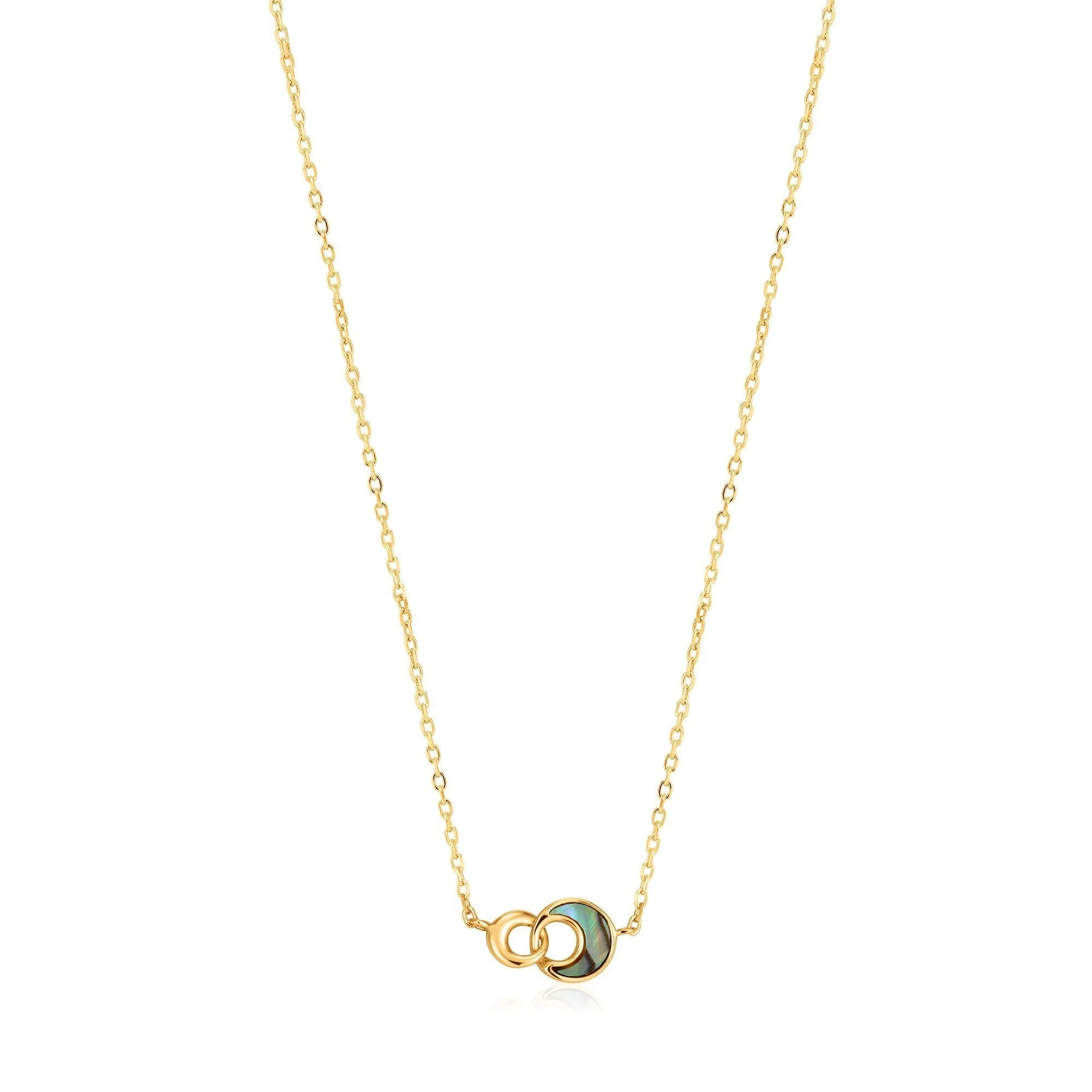 The Ania Haie Gold Tidal Abalone Crescent Link Necklace captures modern elegance with its 14kt gold plating on sterling silver, graced by a striking abalone stone that radiates natural beauty. The graceful crescent link detail showcases the brand’s signature modern design, offering a unique, refined statement for everyday wear or special occasions. The adjustable 380mm chain with a 50mm extender ensures a comfortable, personalized fit, and at just 2.0g, it feels effortlessly light. Perfect for those seeking a distinguished touch in their jewelry collection, this necklace from the Turning Tides Collection brings together contemporary style and timeless sophistication in one exquisite piece.