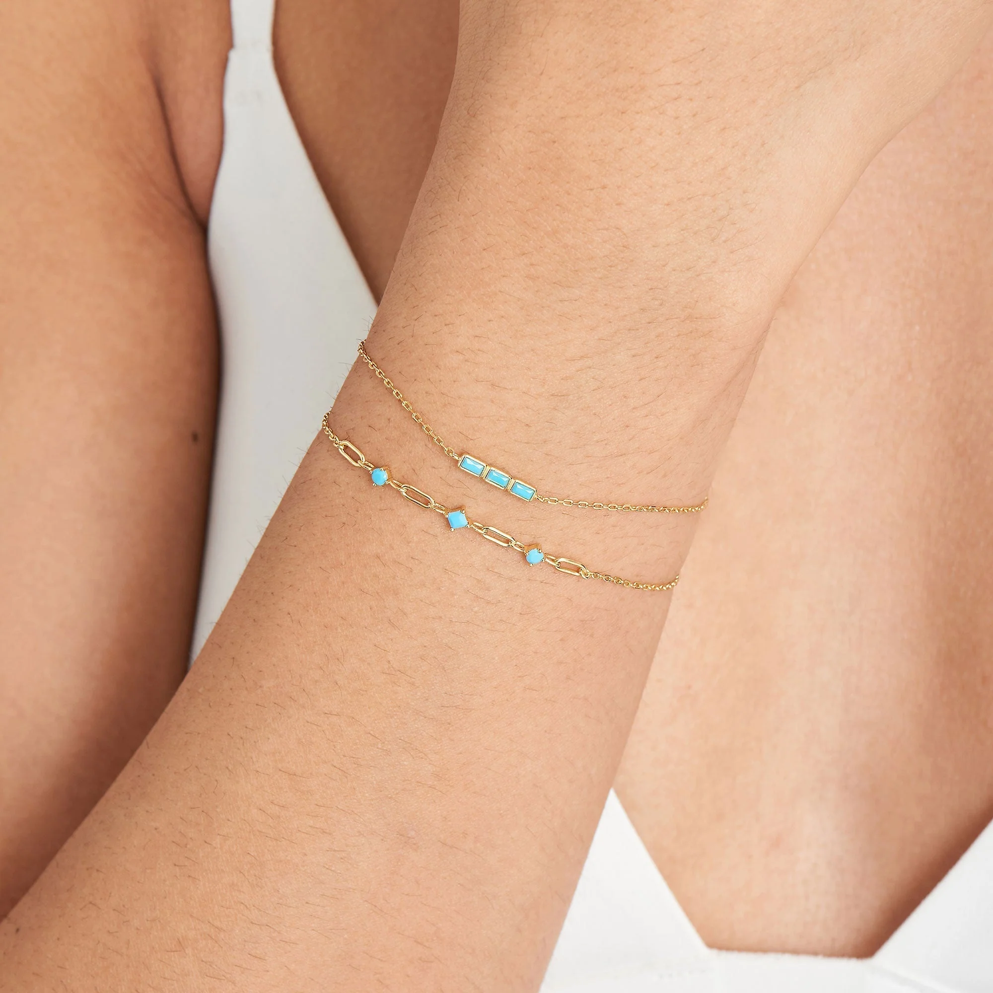 The Ania Haie Gold Turquoise Bar Bracelet offers an elegant approach to modern jewelry, effortlessly blending sterling silver with a radiant 14kt gold plating for a sleek, polished finish. A trio of vibrant composite turquoise stones sits delicately atop a fine chain, capturing the perfect balance of subtlety and statement-worthy appeal. Lightweight and comfortable, this women’s bracelet features an adjustable length for a tailored fit and embodies the signature Ania Haie flair for unique, trendsetting design. Refined yet approachable, it’s an essential accessory for those who appreciate contemporary style and exceptional craftsmanship in premium jewelry.