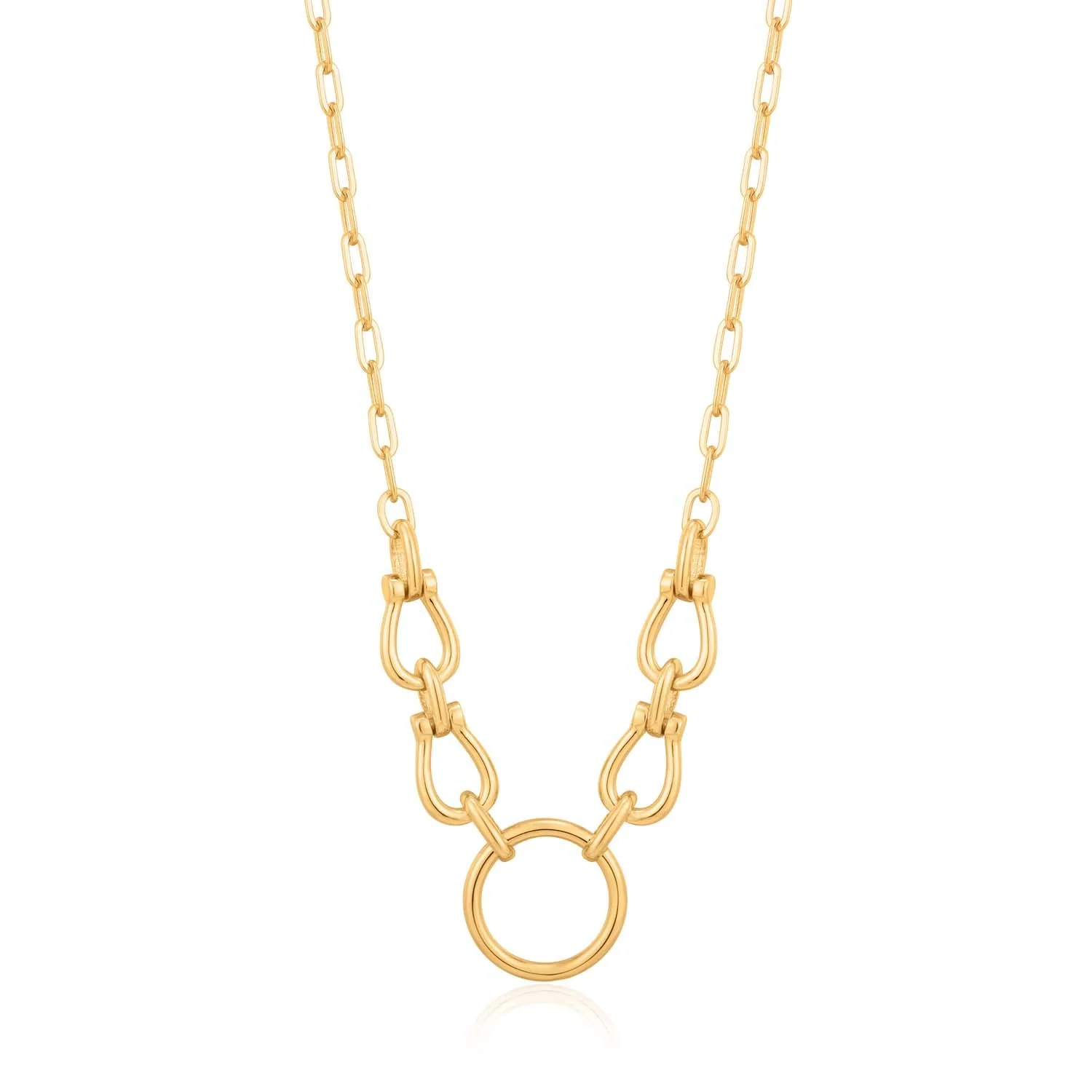 The Ania Haie Horseshoe Link Necklace in gold elegantly combines contemporary style with timeless craftsmanship, making it the perfect choice for those seeking a refined statement piece. Crafted from 925 sterling silver and finished with radiant 14kt gold plating, this women’s necklace shines with sophisticated allure. The distinctive horseshoe links and central circle pendant capture a modern aesthetic, while the robust spring clasp ensures lasting security. With an adjustable length designed for versatility, this premium jewelry piece from Ania Haie’s renowned Chain Reaction Collection elevates any look with its sleek profile and luxurious finish.