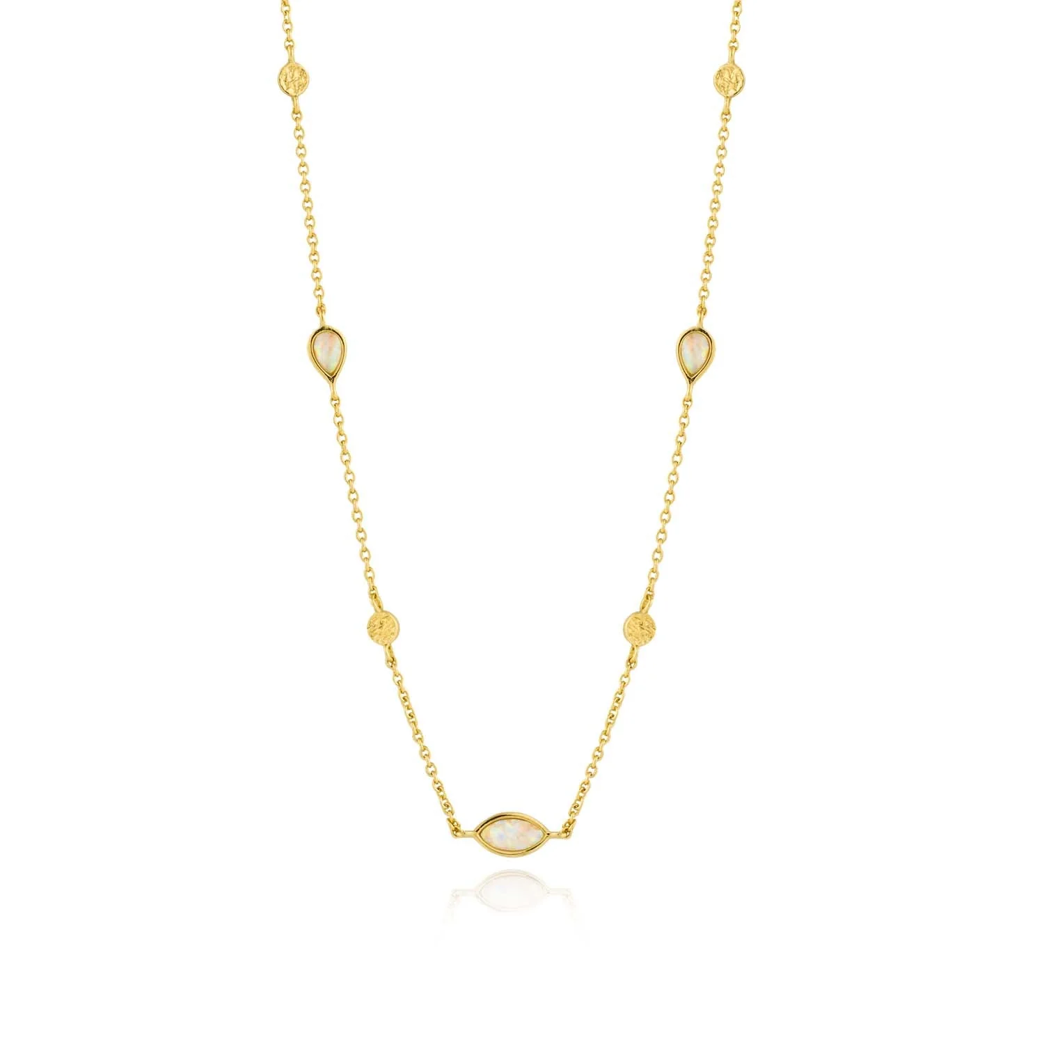 The Ania Haie Opal Colour Necklace in gold offers an effortless expression of elegance, blending modern design with timeless luxury. Crafted from 925 sterling silver and adorned with 14kt gold plating, this piece features a central marquise-cut opal-colour stone, four textured discs, and two petite teardrop accents for a refined touch. Its graceful silhouette and adjustable extender ensure versatile wear, while the spring clasp provides seamless fastening. Perfect as a statement women’s necklace, it showcases Ania Haie’s reputation for distinctive jewelry with sophisticated appeal, elevating any ensemble with a luminous finish.