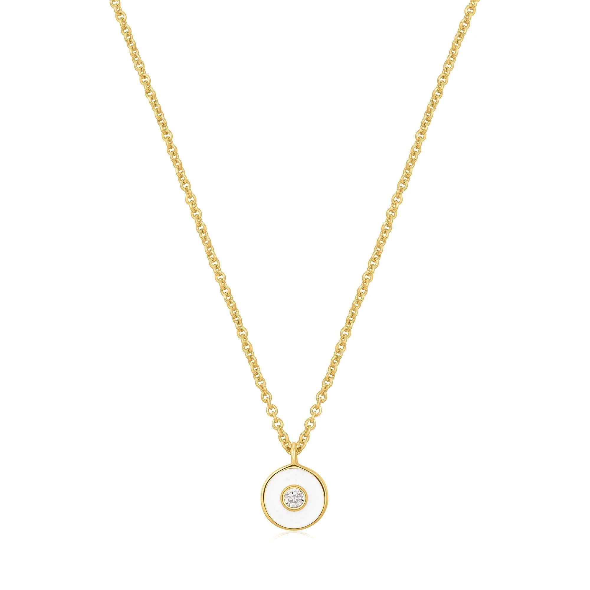 The Ania Haie Optic White Enamel Disc Gold Necklace dazzles with modern elegance, featuring a 14kt gold-plated sterling silver chain and a radiant optic white enamel disc pendant. Meticulously crafted for a delicate yet eye-catching effect, this necklace embodies both contemporary style and timeless charm. Luxuriously lightweight for effortless daily wear, its adjustable length ensures a comfortable, versatile fit. Perfect for layering or wearing solo, this piece effortlessly elevates any look, making it a must-have addition to any jewelry collection seeking a fresh, fashionable touch.