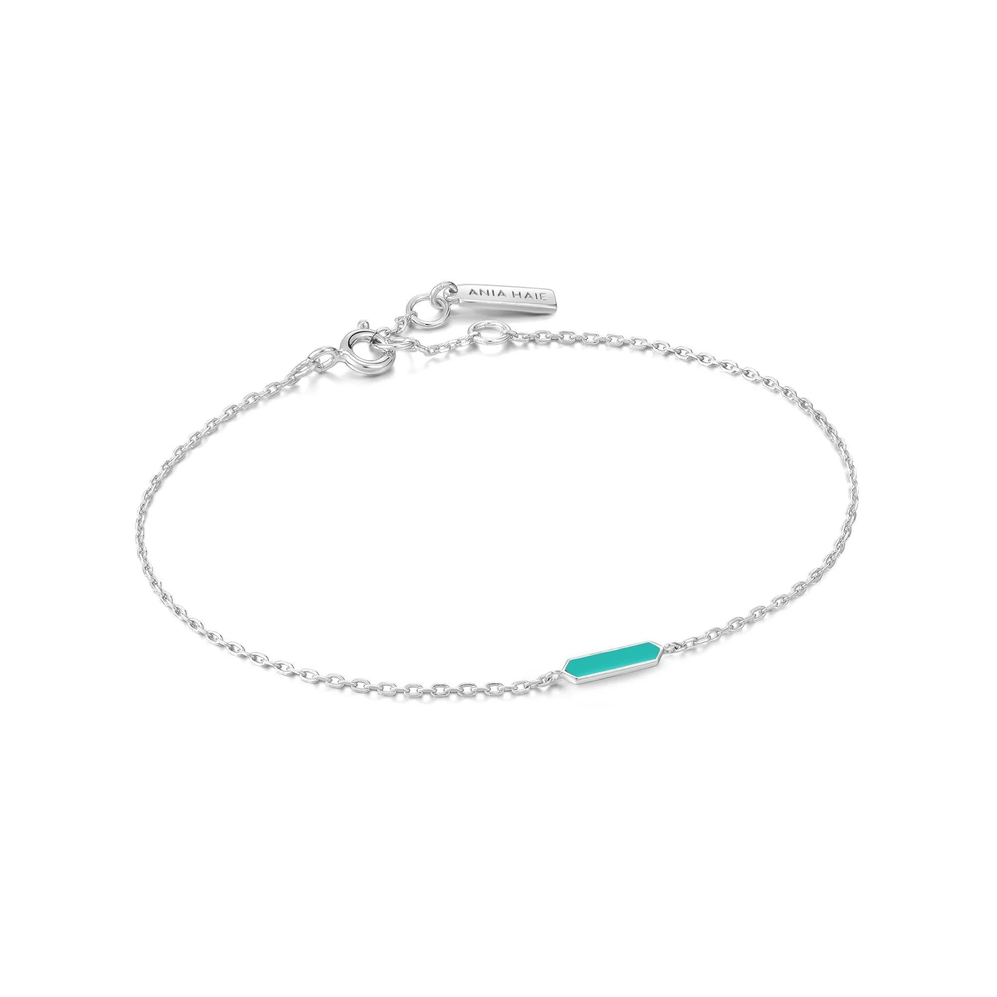 The Ania Haie Teal Enamel Bar Silver Bracelet elegantly combines contemporary style with timeless craftsmanship. Featuring a sleek, teal enamel bar set on a delicate chain, this bracelet is crafted from 14kt gold plated sterling silver for a luminous, luxurious finish. Light in weight yet striking in design, it embodies the signature quality and on-trend appeal Ania Haie is known for. Perfect for layering or wearing alone, this women’s bracelet effortlessly enhances your everyday jewelry collection with a vibrant pop of color and refined sophistication.
