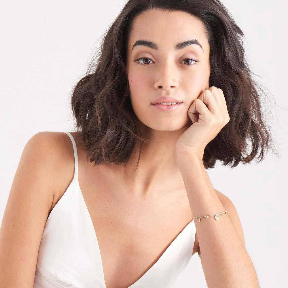 This elegant Ania Haie Turquoise Labradorite Bracelet captures modern sophistication through its blend of lustrous 925 sterling silver and radiant 14kt gold plating. The delicate bracelet features faceted labradorite beads, a striking turquoise teardrop centerpiece, and textured gold disc accents, all secured with a refined spring clasp. Part of the exclusive Mineral Glow collection, this women’s bracelet seamlessly balances statement style with understated luxury, making it an ideal addition to both everyday and special occasion looks. The adjustable length ensures a comfortable fit, while each detail reflects Ania Haie’s commitment to exceptional craftsmanship and distinct design within fine jewelry.