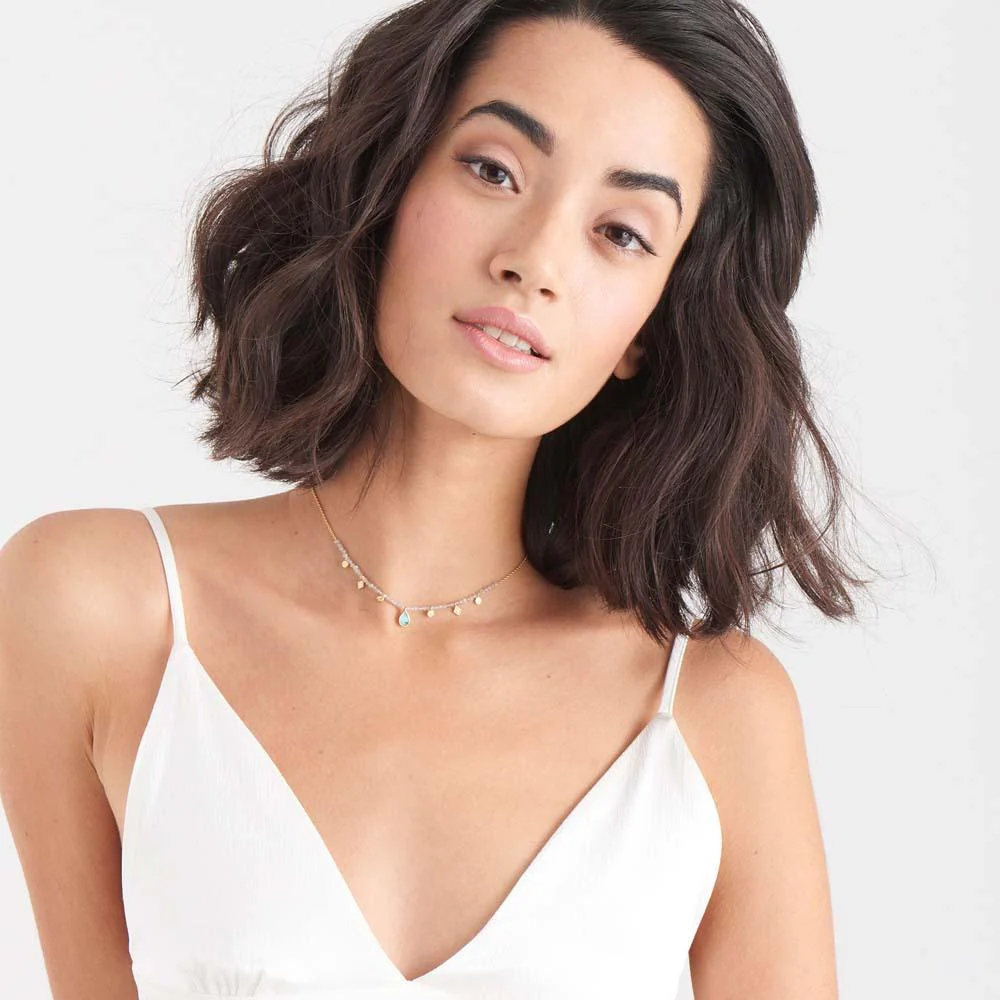 The Ania Haie Turquoise Labradorite Necklace in gold showcases 48 faceted Labradorite beads and a striking turquoise tear stone drop, all elegantly set on a 925 Sterling Silver chain with 14kt gold plating. Accented by four round textured discs and two diamond-textured drops, this necklace reflects sophisticated detail and modern design. The adjustable length makes it perfect for layering or wearing as a statement piece, while a secure spring clasp ensures ease and comfort. An exquisite addition to the jewelry collection, this necklace is ideal for elevating both casual and formal looks.