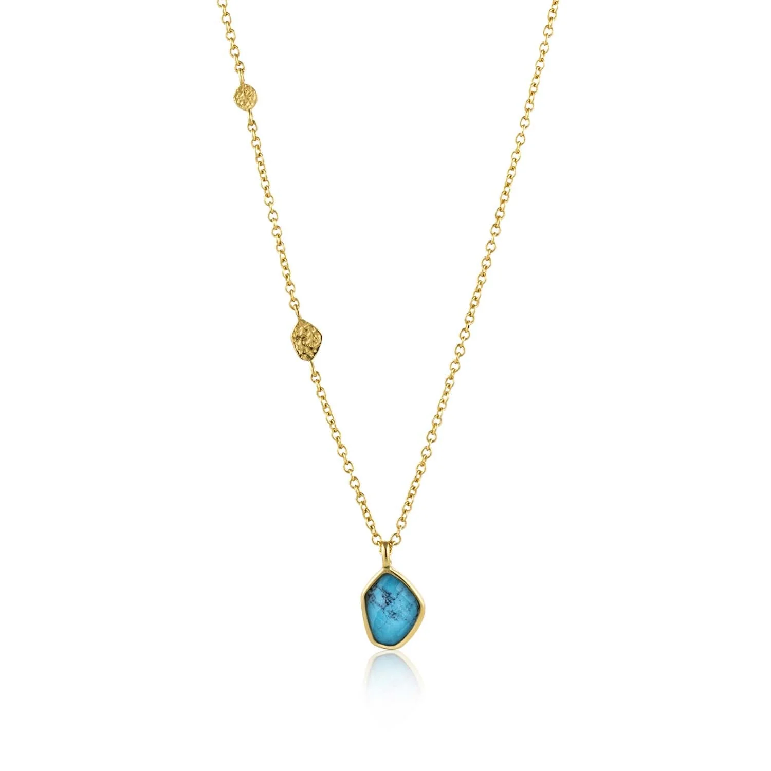 Crafted by Ania Haie, this Turquoise Pendant Necklace in gold brings effortless sophistication to your jewelry collection. The mid-length chain, made of 925 sterling silver with a 14kt gold plating, elegantly showcases a unique turquoise stone, complemented by textured gold discs for added allure. Its spring clasp ensures comfort and secure wear, making this necklace a subtle statement piece for those who appreciate refined, modern design. Perfectly suited to elevate both casual and formal outfits, it effortlessly captures the essence of contemporary style with a touch of timeless glamour.