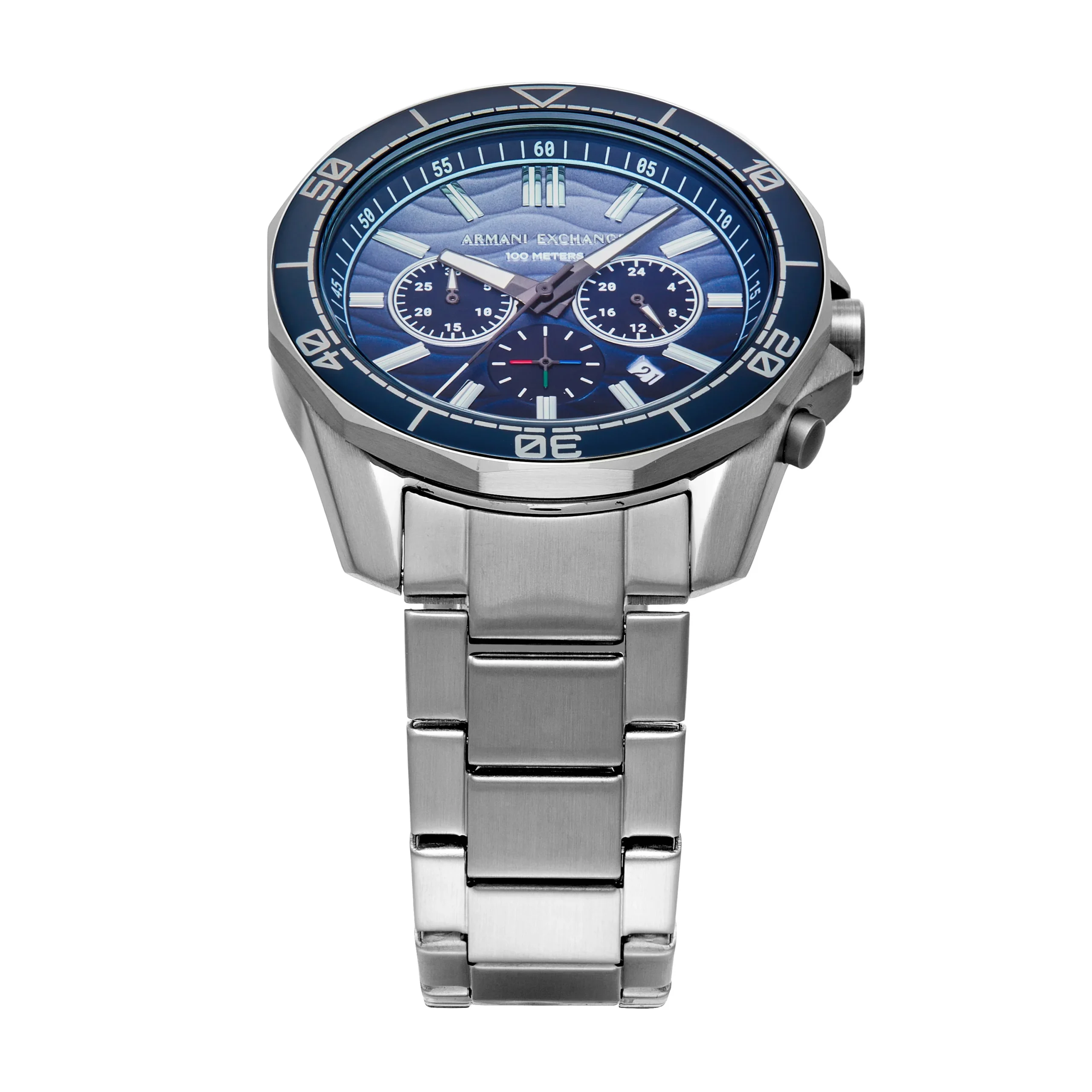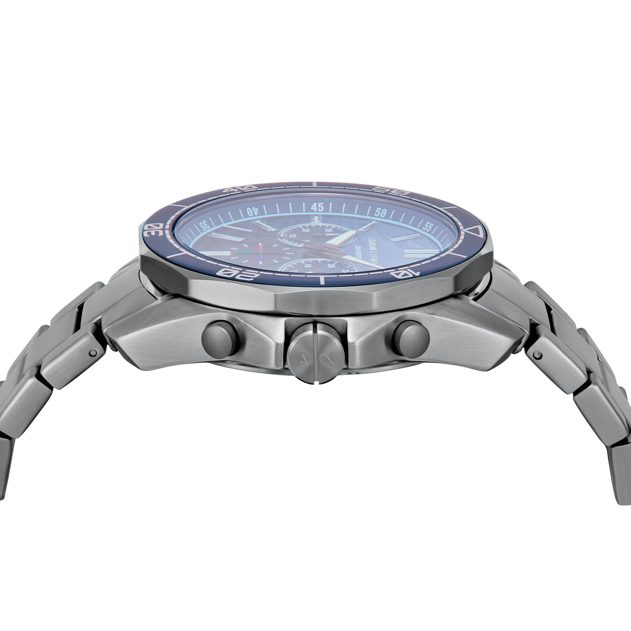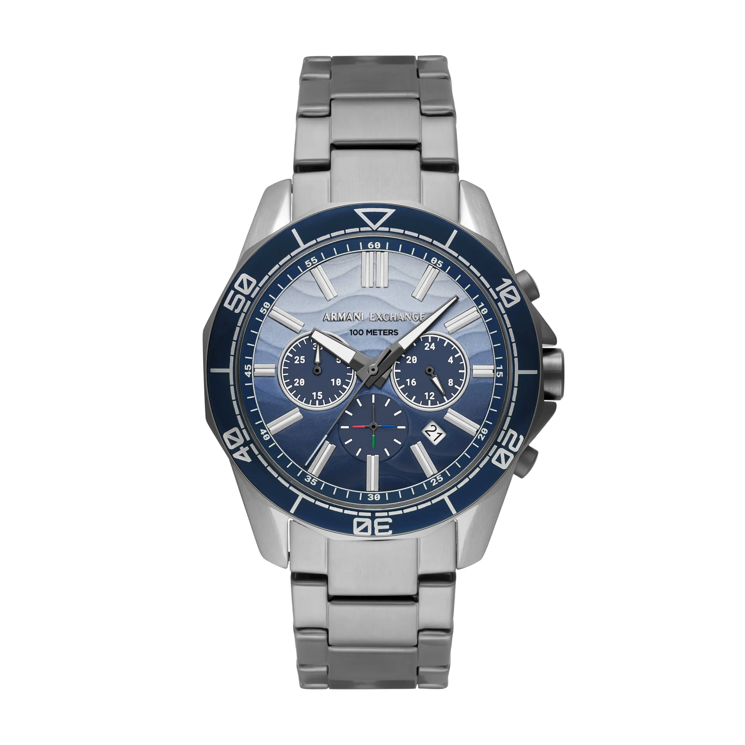 Bold and refined, the Armani Exchange Chronograph Blue Dial Gunmetal Stainless Steel Watch AX1967 captures modern sophistication through its striking contrast of a textured blue dial against a sleek gunmetal finish. Designed as a standout men’s watch, its durable stainless steel case and 22mm bracelet offer a masculine profile while maintaining all-day comfort. The 44mm case houses a precise quartz chronograph movement, protected by a mineral crystal lens for everyday resilience. Water resistance to 100 meters ensures versatility from meetings to weekend adventures. With its clean layout, chronograph sub-dials, and polished accents, this timepiece blends functionality with statement-making style, making it a distinctive addition to any watch collection.