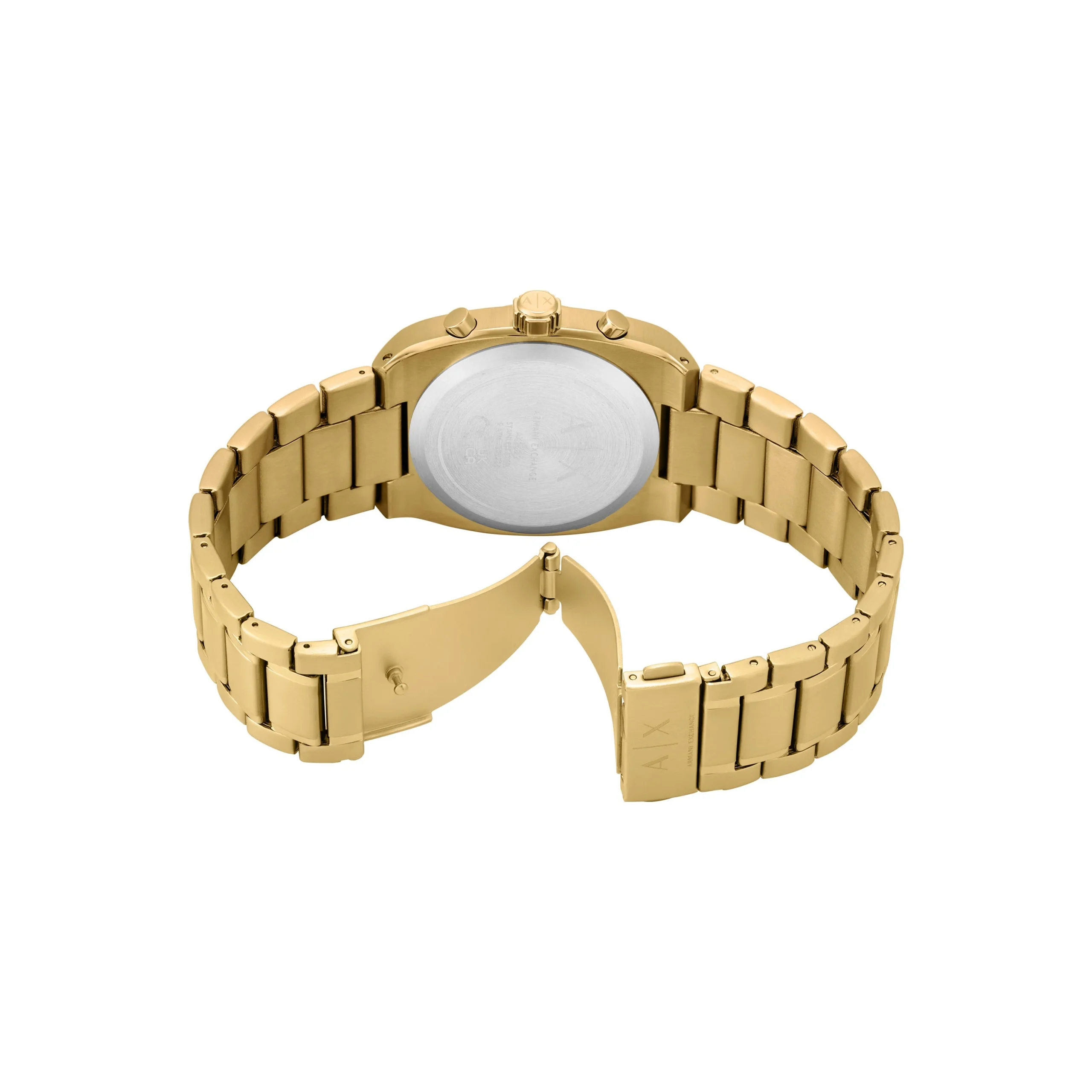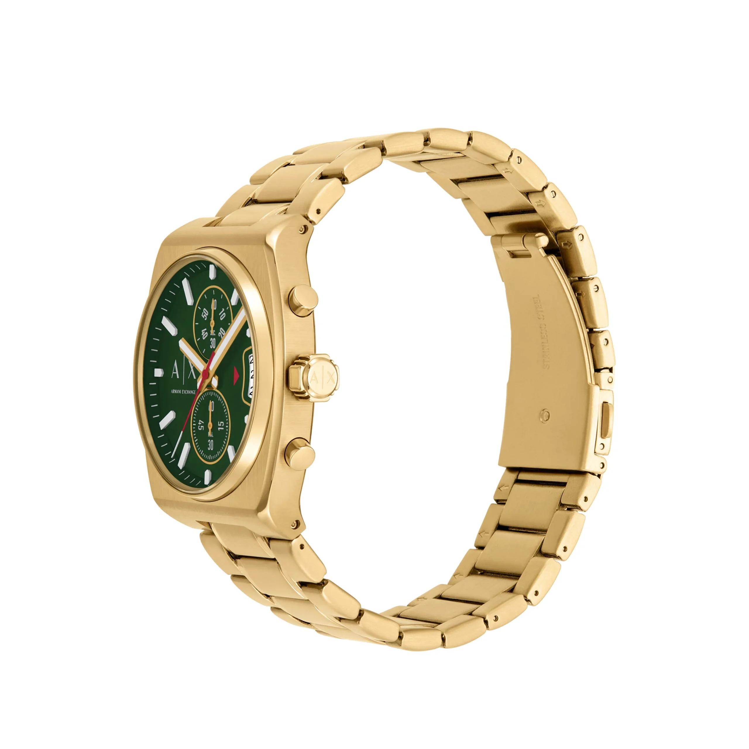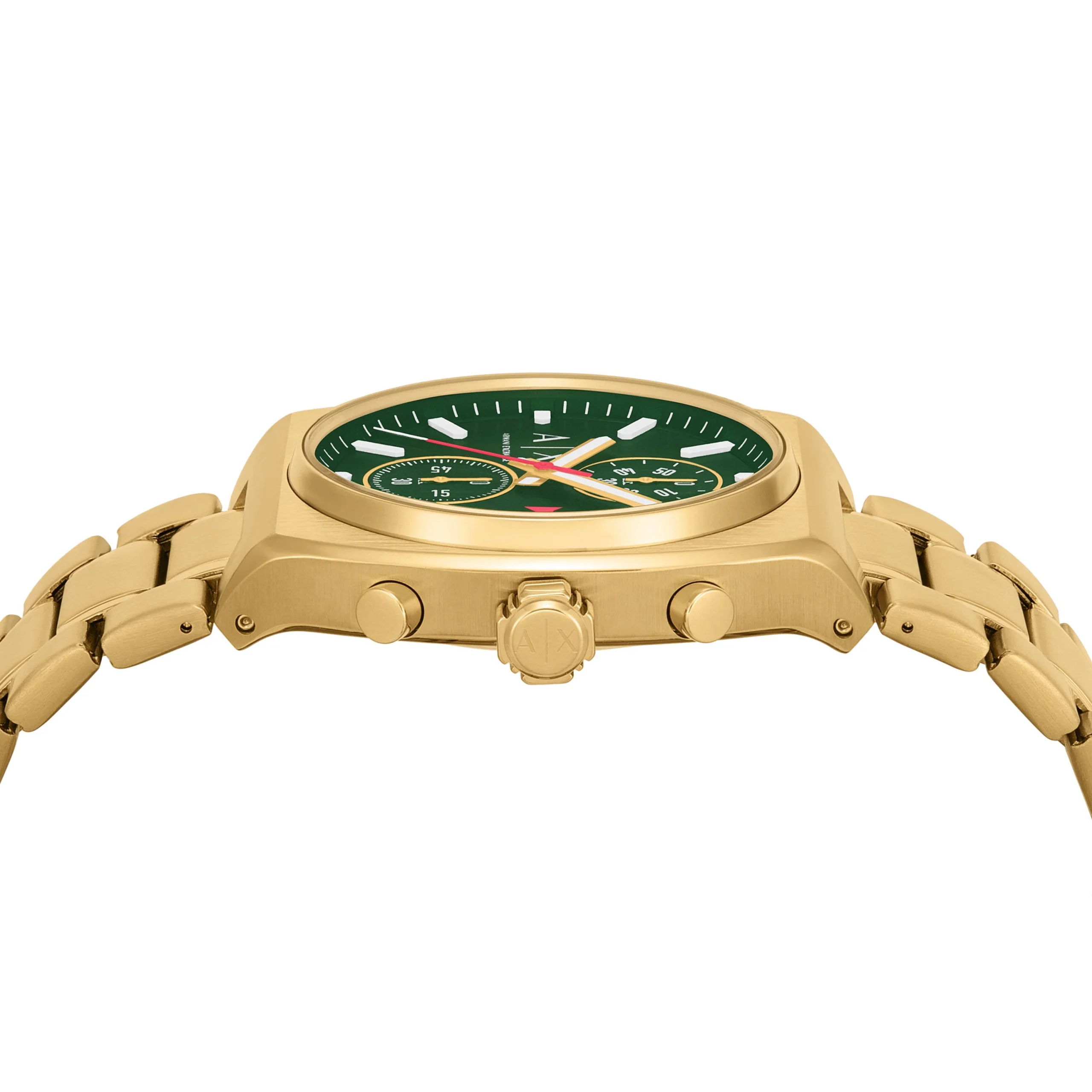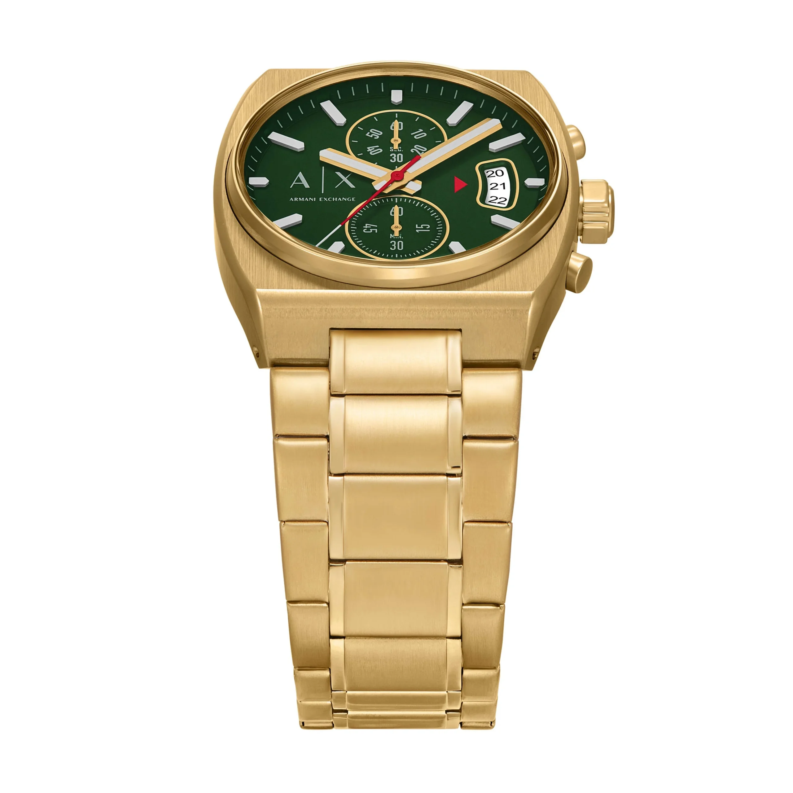 The Armani Exchange Chronograph AX2822 brings refined boldness to the wrist with its brushed green matte dial set against a sleek gold-tone rectangular case. The 40mm stainless steel case and matching bracelet seamlessly blend modern design with classic appeal. Precision-crafted chronograph sub-dials add functional elegance, while the mineral crystal glass enhances durability. Powered by reliable quartz movement and water resistant up to 50 meters, this men’s watch is both stylish and dependable. A signature piece that captures Armani’s legacy of sophisticated design, perfect for elevating everyday moments with a touch of luxury.