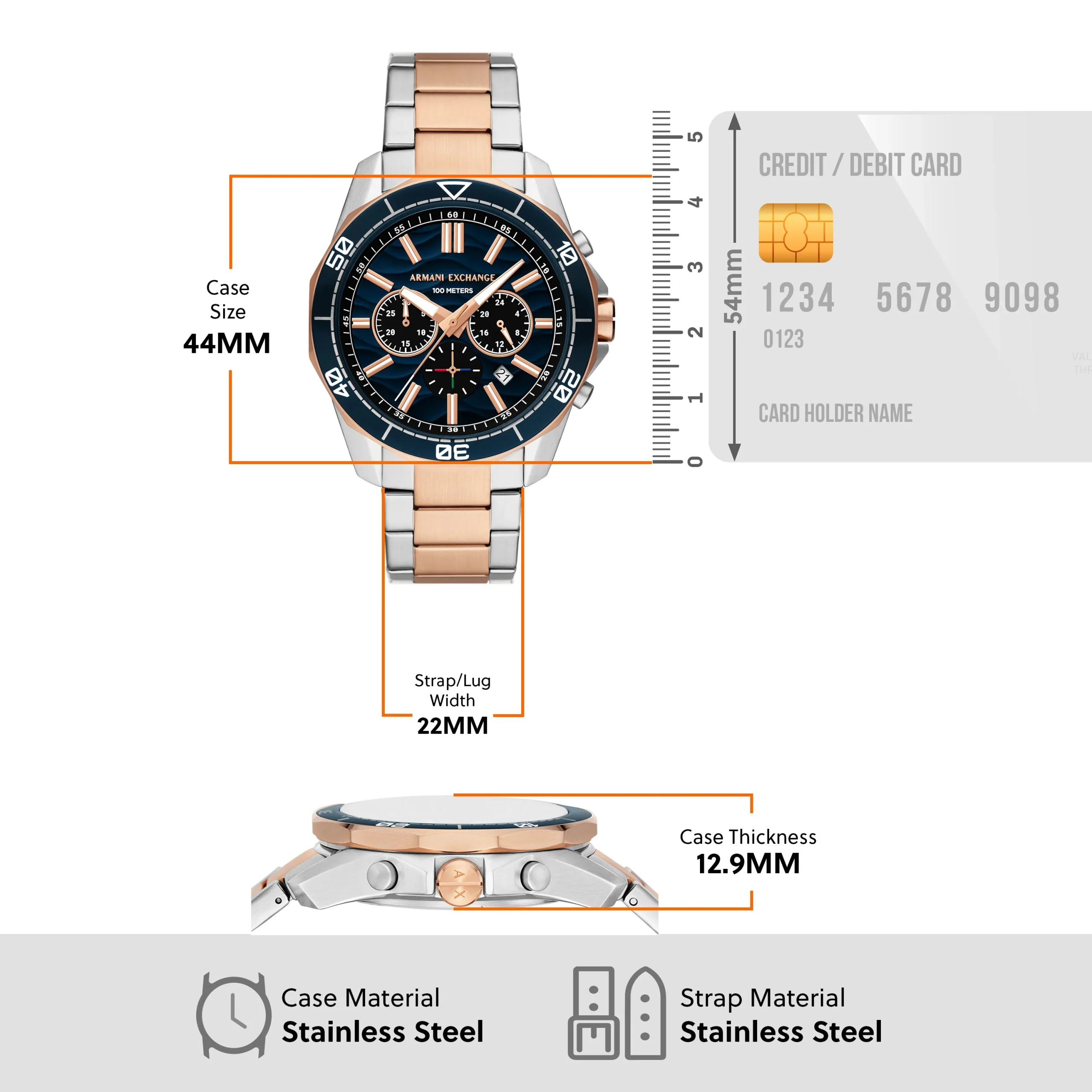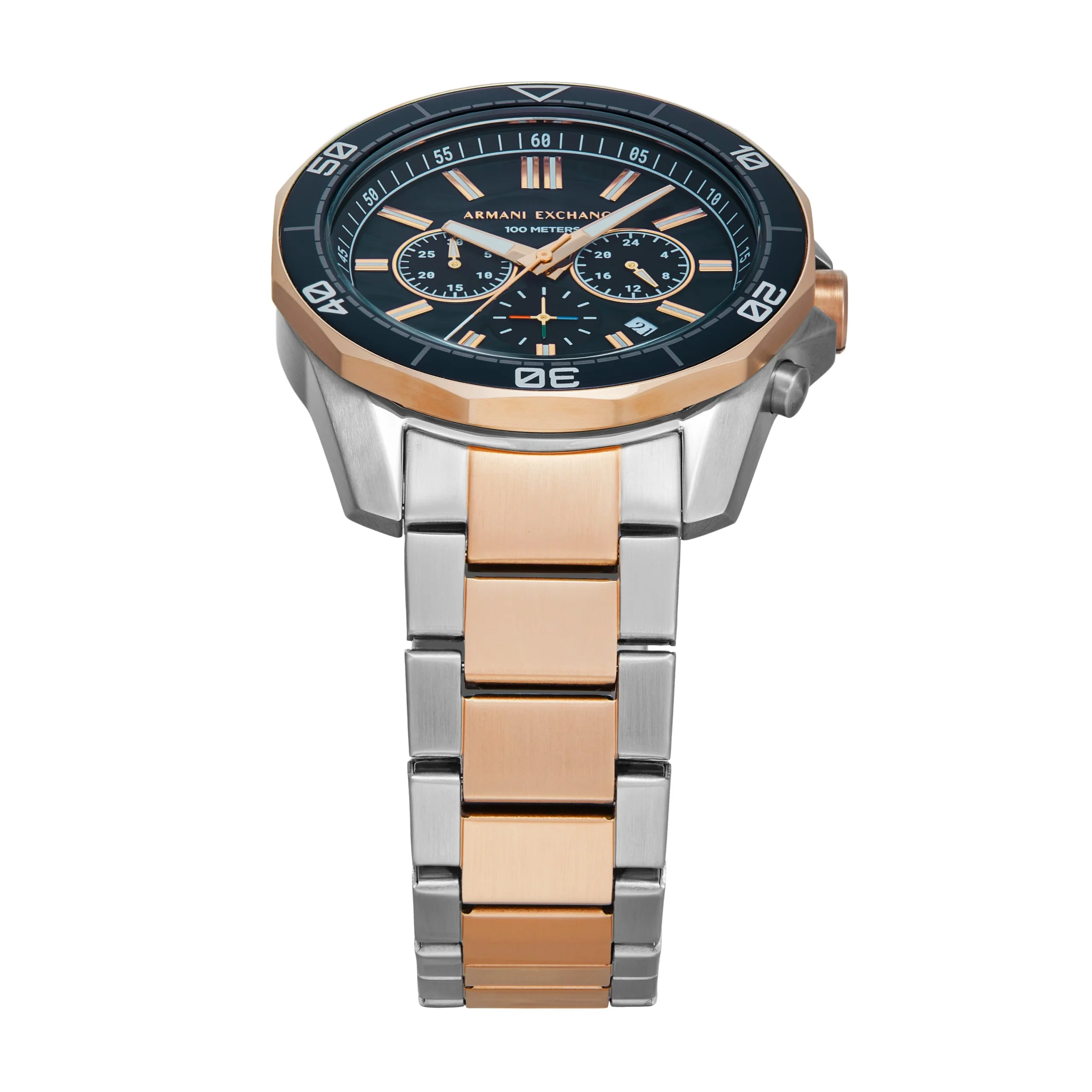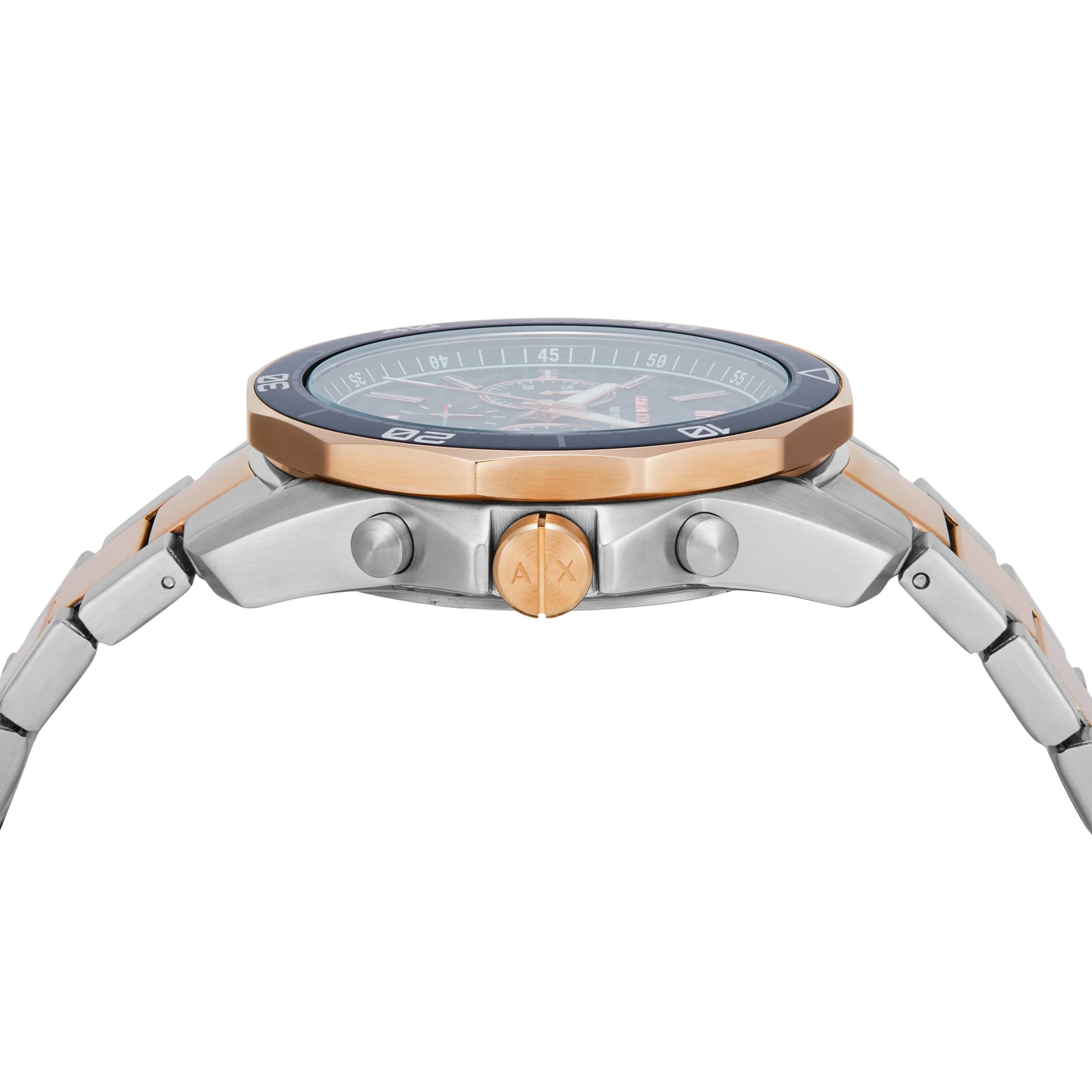 Designed for those who value precision and presence, the Armani Exchange AX1965 men’s watch blends contemporary functionality with timeless elegance. Its bold 44mm case showcases a refined two-tone stainless steel construction in silver and rose gold, contrasted by a deep blue dial with luminous markers and chronograph sub-dials. Crafted with a durable mineral crystal glass and quartz chronograph movement, this timepiece ensures reliable performance and style. The stainless steel band with foldover clasp offers a secure and comfortable fit, while the 100-meter water resistance makes it suitable for both daily wear and casual aquatic adventures. Sophisticated details and polished craftsmanship make it a standout piece in the watches category, offering a perfect balance of fashion and function.