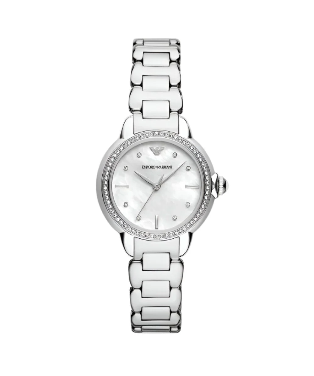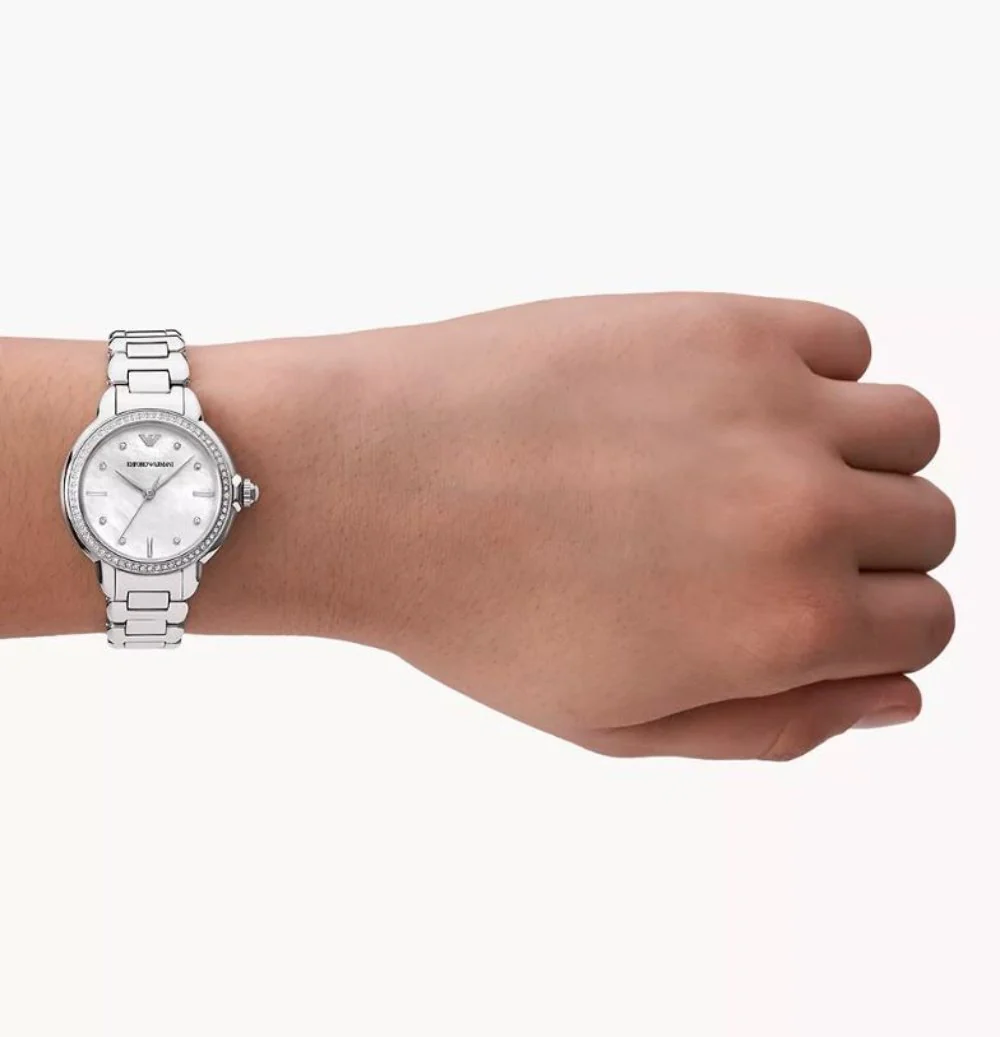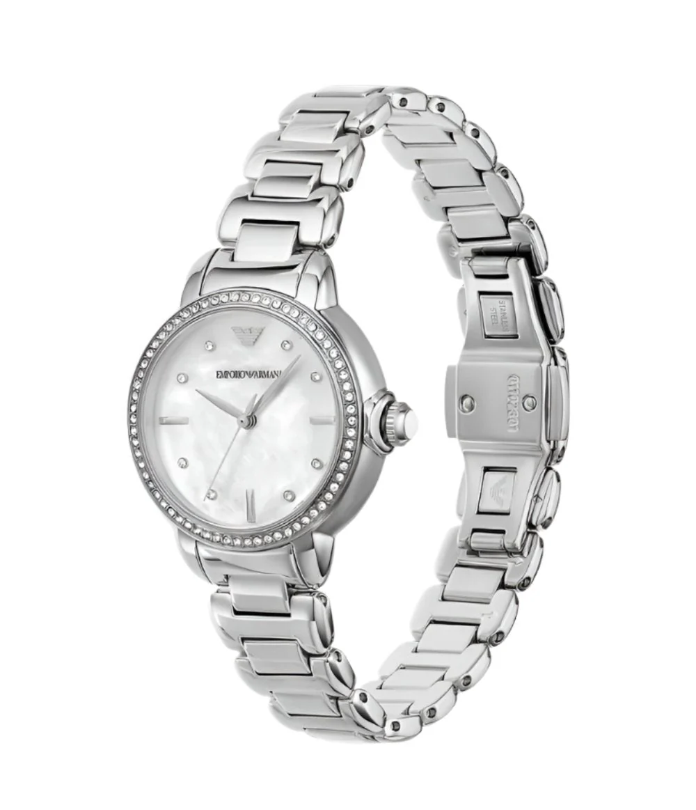The Armani AR11596 women’s watch blends refined elegance with modern function, featuring a polished 32mm stainless steel case and a lustrous silver-toned bracelet. Its mother-of-pearl dial, accented with minimalist markers, offers subtle luxury beneath a protective mineral crystal glass. Crafted with precision quartz movement, this timepiece ensures dependable timekeeping while exuding contemporary style. The bracelet butterfly deployant closure enhances comfort and fit, seamlessly integrating into the sleek stainless steel band. Water resistant up to 50 meters, it balances practicality with sophistication, making it a standout in the watches category. Perfectly suited for both formal occasions and everyday wear, this silver dial stainless steel watch brings timeless design to the forefront of your accessory collection.