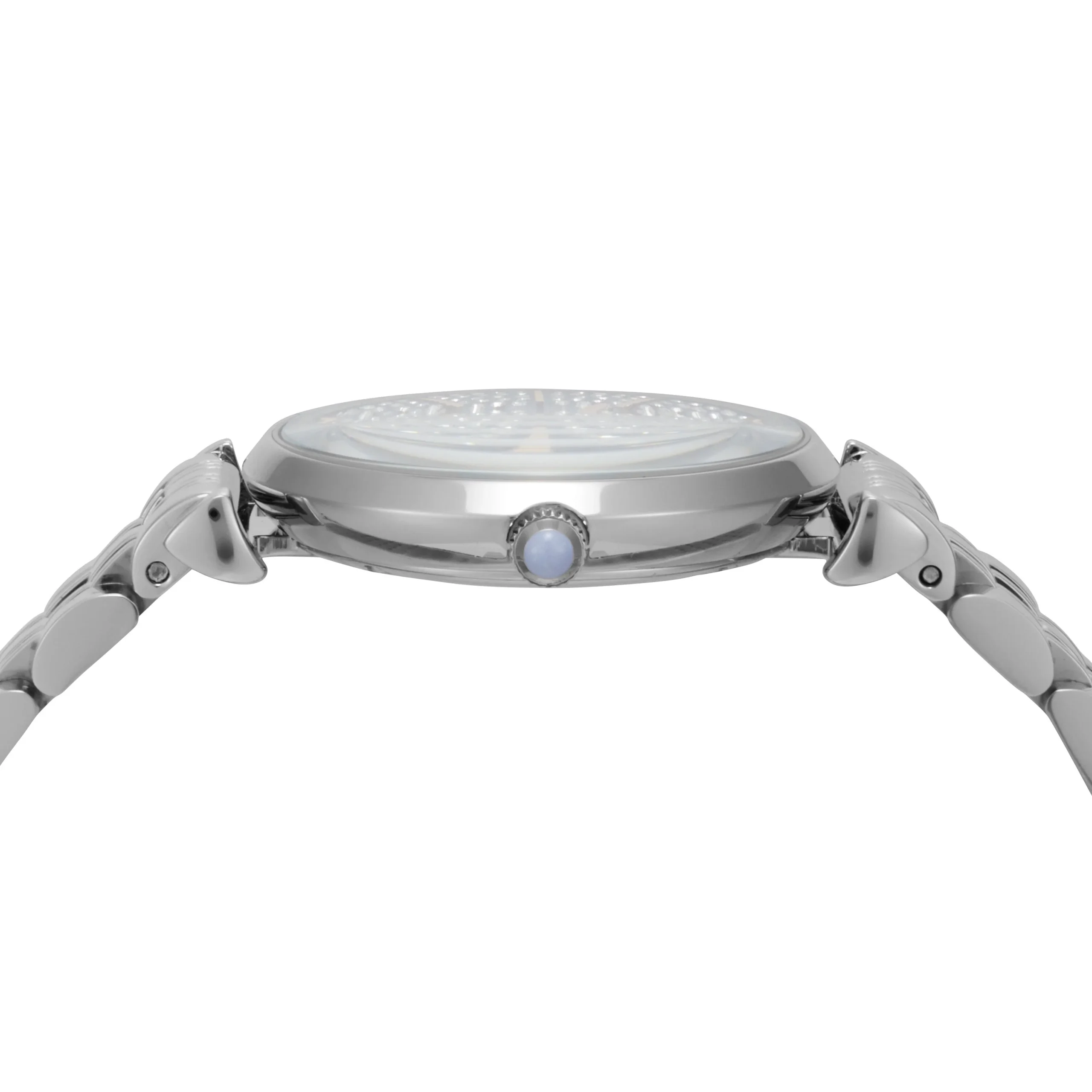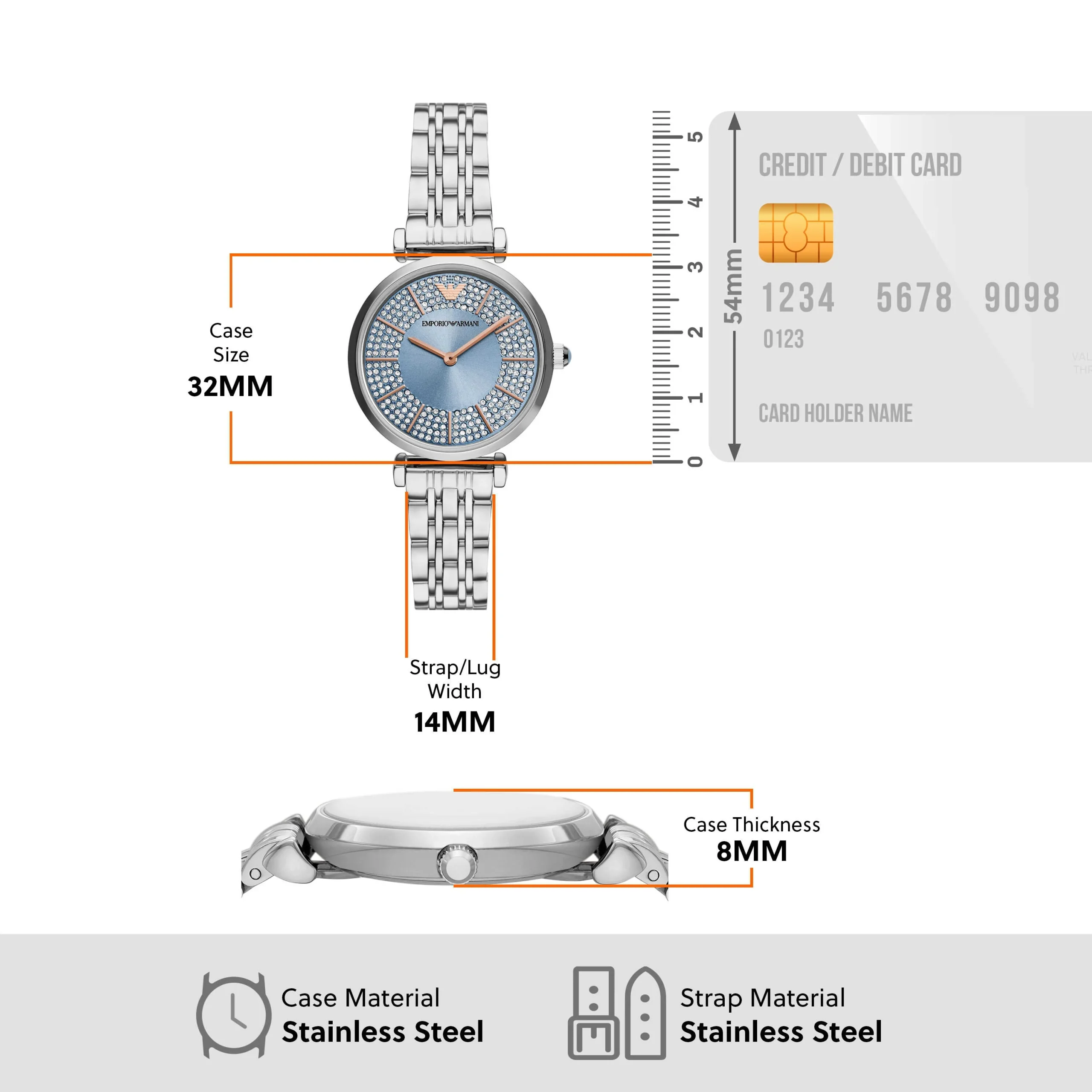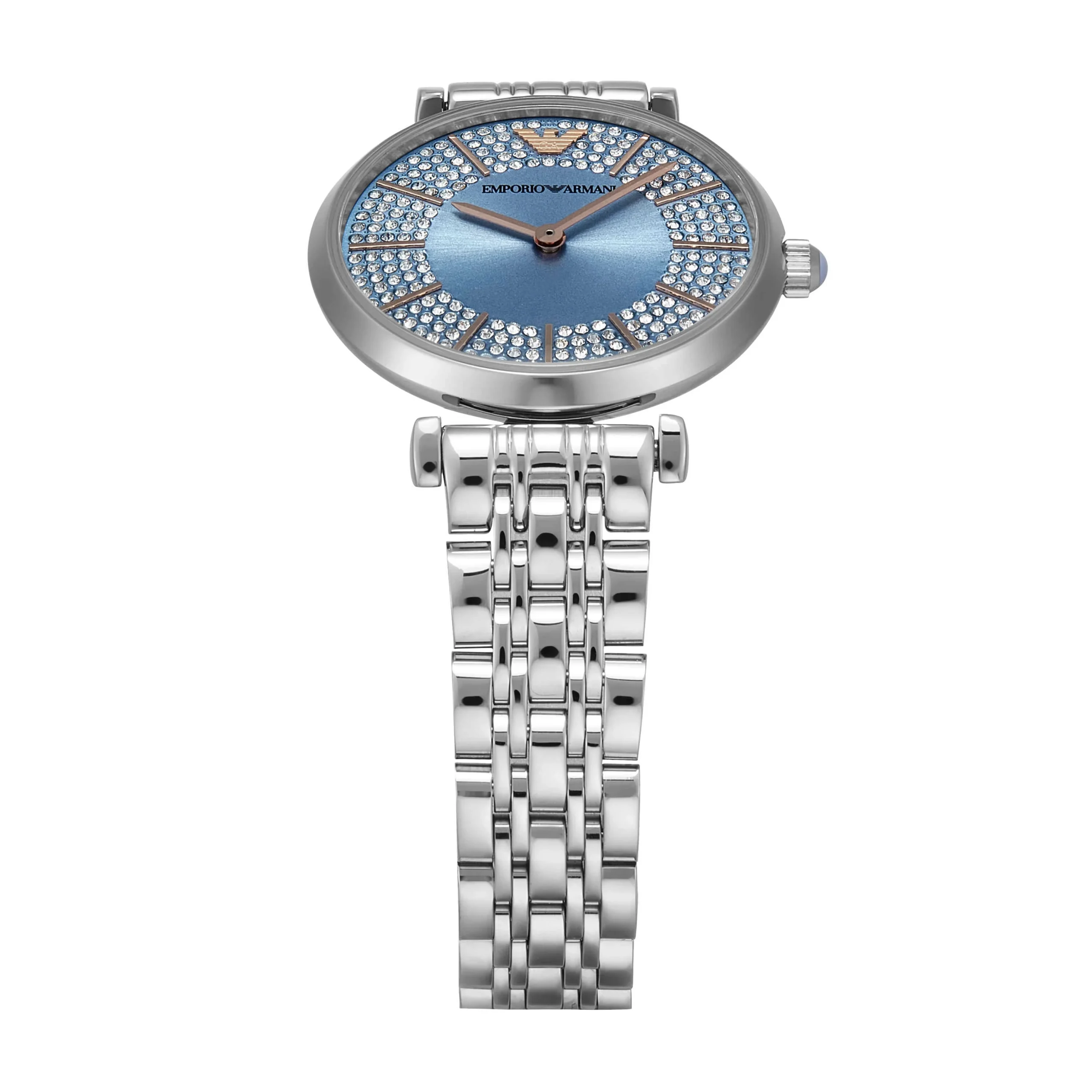 Refined and feminine, the Emporio Armani AR11594 women’s watch combines modern elegance with timeless design. The 32mm case frames a captivating blue sunray dial adorned with shimmering crystal accents that radiate sophistication. Its stainless steel bracelet features a polished finish, offering a sleek and comfortable fit for everyday luxury. Powered by reliable quartz movement and protected by mineral crystal glass, this watch delivers both precision and durability. Water resistance up to 30 meters adds a practical touch, while the signature Armani logo at 12 o’clock embodies the brand’s iconic style. A perfect blend of craftsmanship and contemporary charm, this timepiece makes a graceful statement for any occasion.
