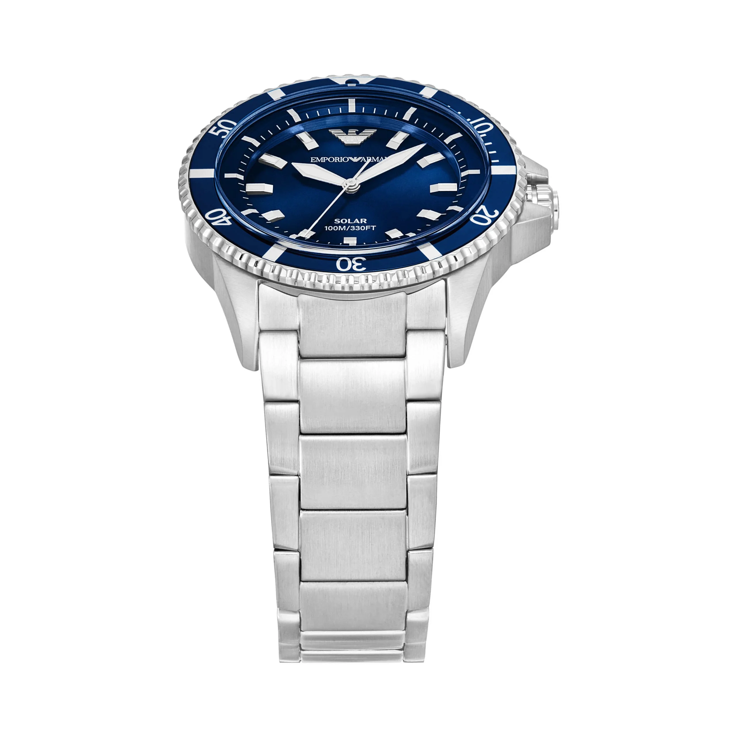 The Emporio Armani World Explorer AR11697 blends refined sophistication with modern innovation. Featuring a 42mm stainless steel case and bracelet, this men’s watch showcases a striking blue sunray dial housed beneath durable sapphire crystal. Designed for effortless daily wear, its solar-powered movement ensures up to four months of performance without a battery change. Water-resistant up to 100 meters, it offers both functionality and style for dynamic lifestyles. Precision craftsmanship and timeless Italian design make this Armani timepiece a commanding statement of elegance and reliability.
