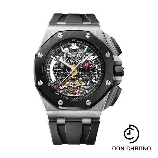 44 mm titanium case, 14.45 mm thick, glareproofed sapphire crystal back, screw-locked crown and titanium pushpiece guards, black ceramic bezel, glareproofed sapphire crystal, satin-brushed black openworked dial with black counters, white gold applied hour-markers and Royal Oak hands with luminescent coating, black Inner bezel, Calibre 2936 hand-wound movement with tourbillon, chronograph, hours, minutes, small seconds, approximately 72 hours of power reserve, black rubber strap, titanium pin buckle. Water resistant to 100 meters.