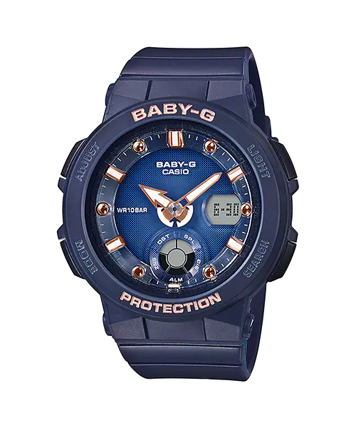 A “Beach Traveler Series” model featuring a summer beach theme. The face is monotone navy blue and the indices are pink.