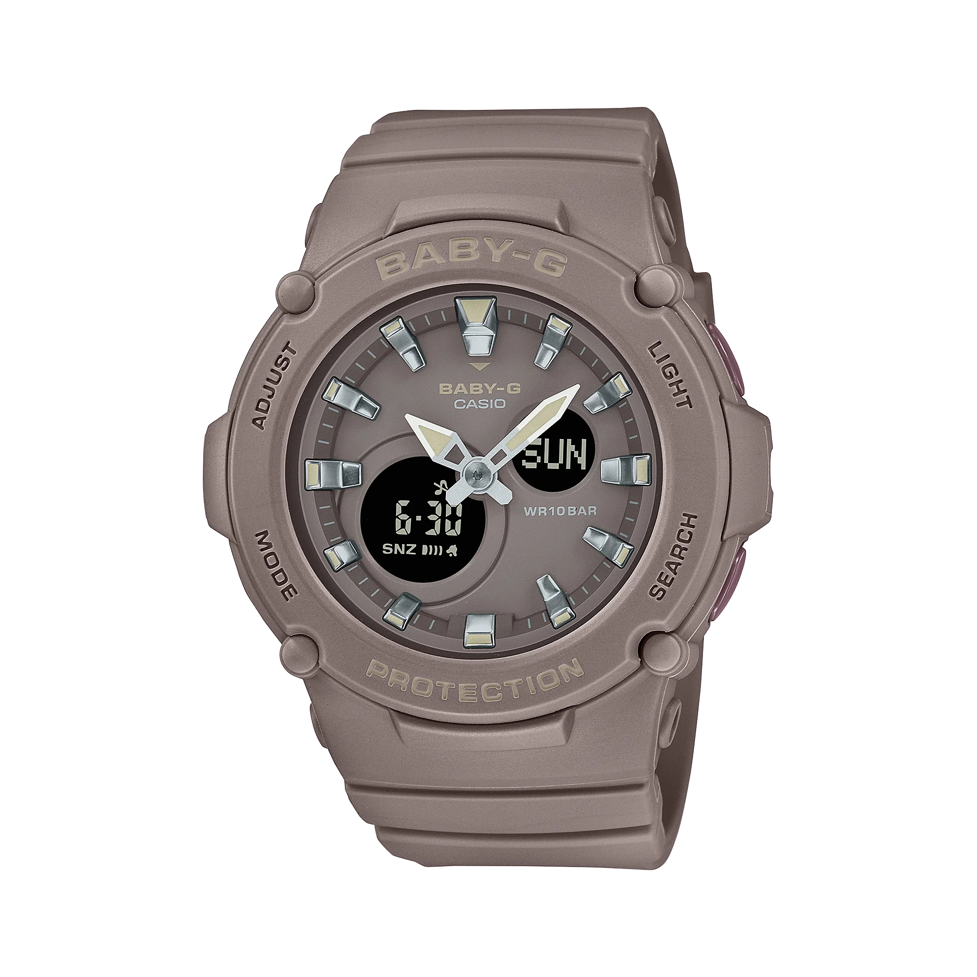 Celebrate the softer side of Mother Earth with understated natural hues in forest green, cotton beige, woody brown, and misty pink. The BGA-275M in forest green features a band imprinted with a subtle camouflage design inspired by the mountains and a marbled bezel crafted with mixed-color resins.