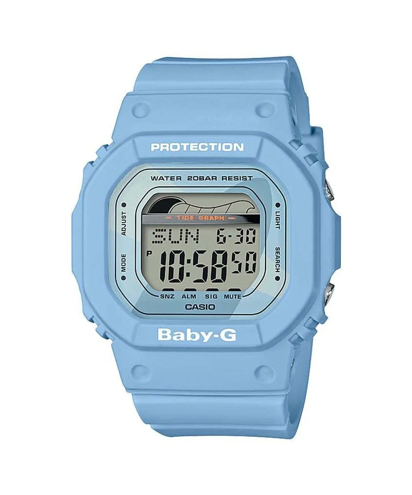 From the G-LIDE sport lineup of BABY-G models with Tide Graph capabilities come new retro surf inspired models. These watches feature Tide Graph, a feature that lets you look up tide information for a variety of surf points. The height of the high tide is shown by the digital display as an easy-to-understand graphic image. Design-wise, the models of this lineup come in standard black or white in addition to blue and green pastel hues that recall the image of retro surfboards. The faces of the blue and green models are decorated with the silhouette of a surfboard. From design to functions, everything about these models is geared towards summertime beach activities.