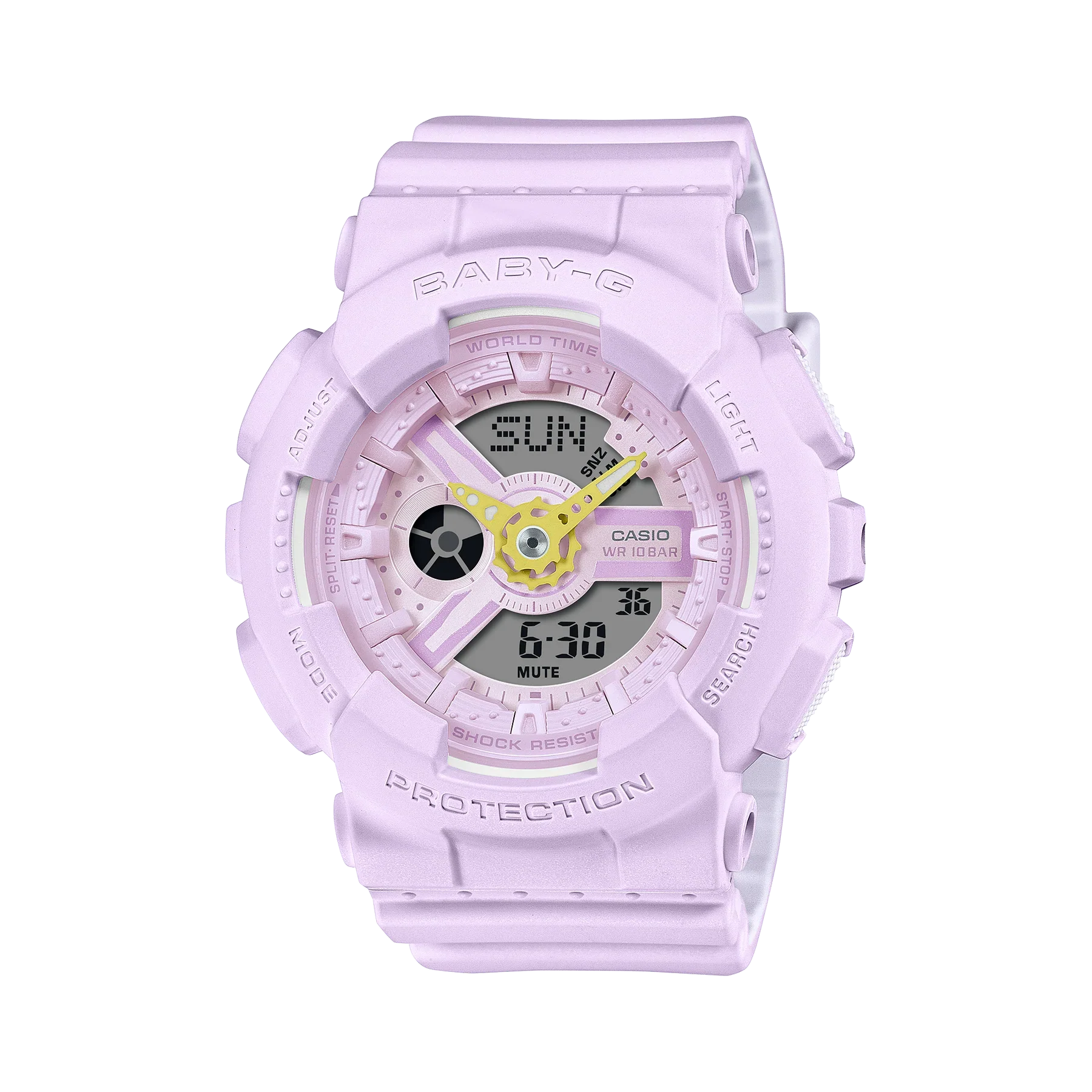 This G-Shock Baby-G Pink Pastel Dial and Resin Case + Band Watch blends a soft, pastel elegance with bold, playful design elements, making it a standout accessory for any occasion. The resin case and band offer exceptional durability and lightweight comfort, while the intricate dial and pastel color palette create a refined yet youthful charm. Accents on the hands add a subtle pop of color, complementing the distinctive look. With quartz movement, mineral crystal glass, and 100-meter water resistance, this men’s and women’s watch seamlessly combines premium craftsmanship with everyday functionality.