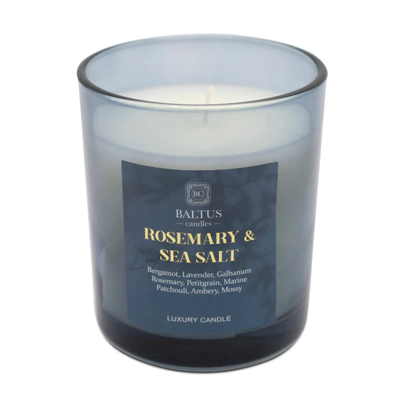 Experience tranquility and elegance with the Baltus Rosemary & Sea Salt Luxury Candle. This 135g candle, presented in a sleek glass container, complements any home decor while inviting soothing aromas into your space.