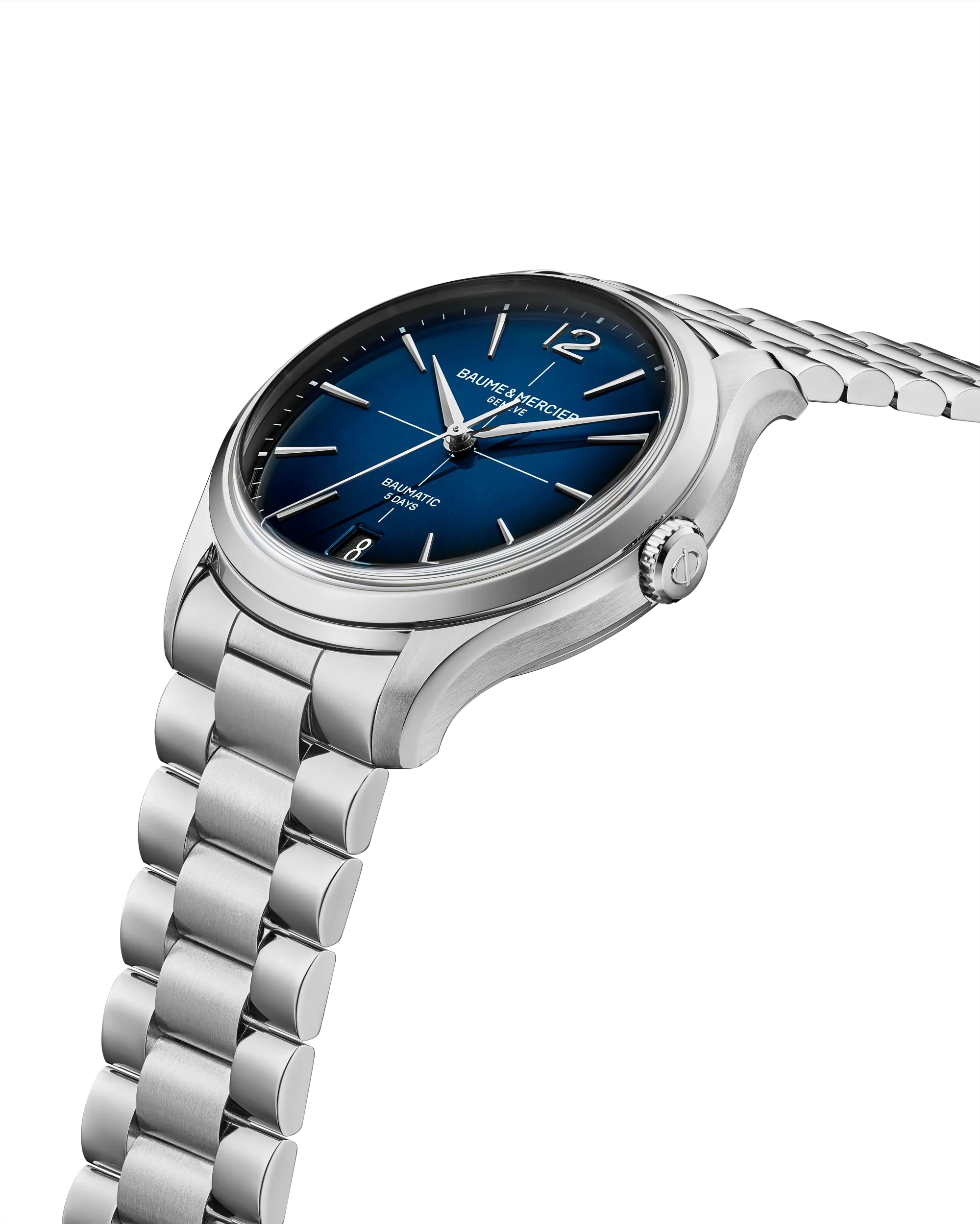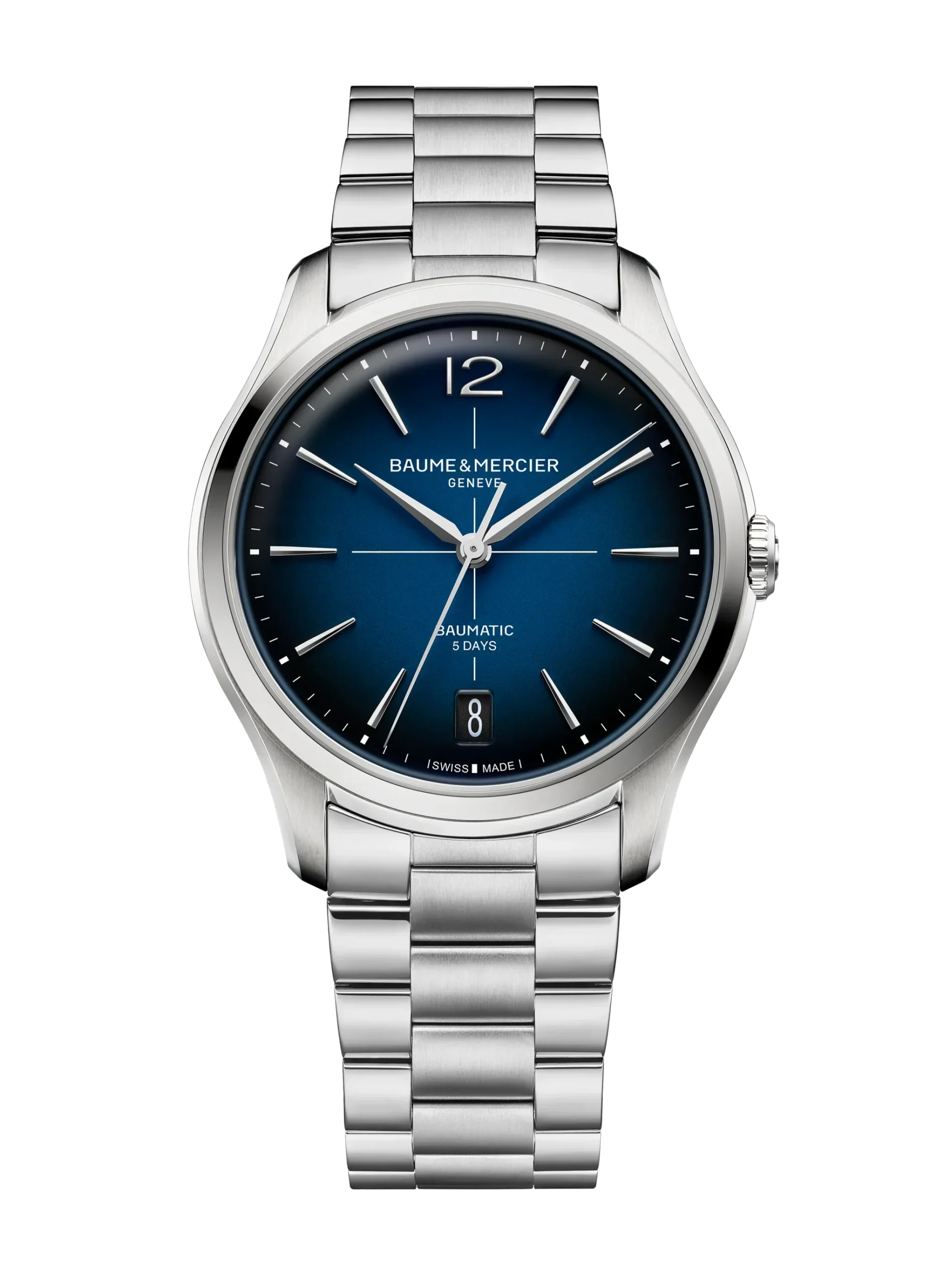 The Baume & Mercier Clifton Automatic 39mm watch exemplifies Swiss craftsmanship with its polished and satin-finished stainless-steel case and bracelet. The striking gradient blue lacquered dial, detailed with a graceful white minute track and a distinctive Arabic numeral at one, adds modern refinement to this timepiece. A sapphire crystal front and open case back invite light to showcase the elegant automatic movement, while a practical date display, 50-meter water resistance, and a 120-hour power reserve ensure reliability. Perfectly sized for enduring comfort and style, this men’s watch arrives in a signature Baume & Mercier box, making it a standout choice in premium watches for discerning collectors and enthusiasts.