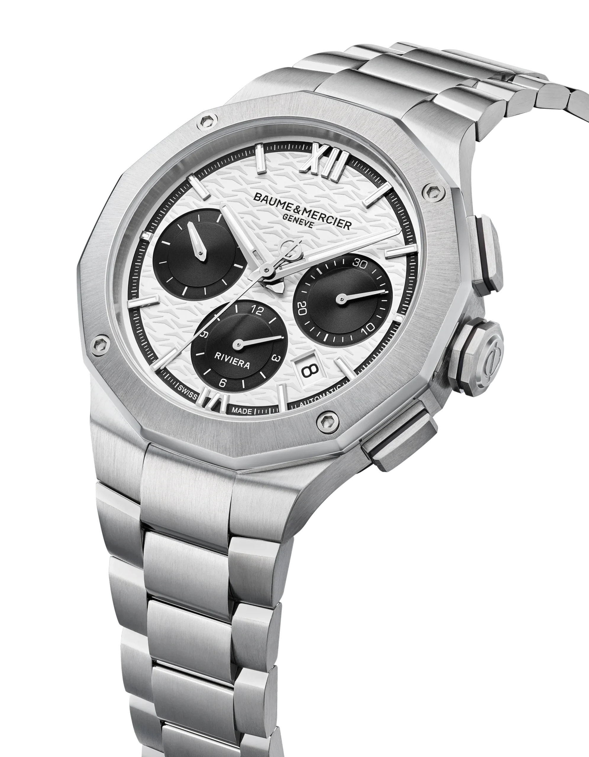 This men’s watch from Baume & Mercier blends modern luxury with timeless sophistication, featuring a distinctive dodecagonal 43mm stainless steel case that frames its bold black-and-white panda chronograph dial. The white wave-patterned face, highlighted by contrasting black snailed counters and rhodium-plated hands, is protected by scratch-resistant sapphire crystal. Precision is ensured by a Swiss-made Baumatic automatic movement, while the polished stainless steel bracelet and premium case finishing reflect outstanding craftsmanship. Water resistance to 100 meters and a sapphire crystal case back complete this elegant statement piece, presented in a premium Baume & Mercier box, perfect for admirers of refined chronograph watches in the apparel and accessories category.