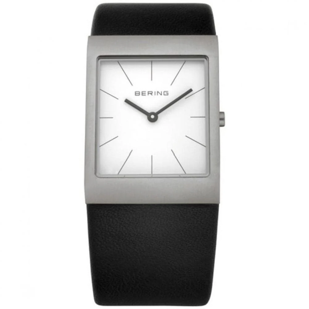 Men’s Bering watch in a stylish black and silver design in stainless steel and leather, set around a white dial with slender baton markers. The watch is powered by Japanese Quartz movement.