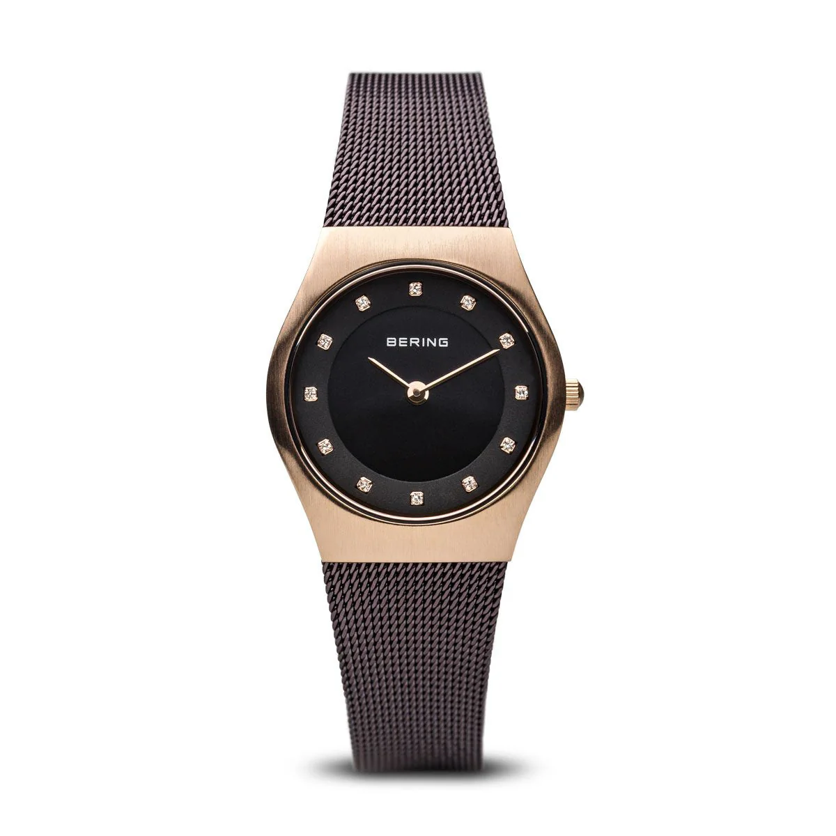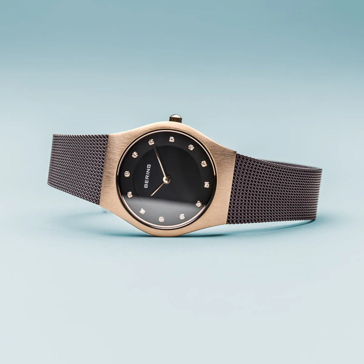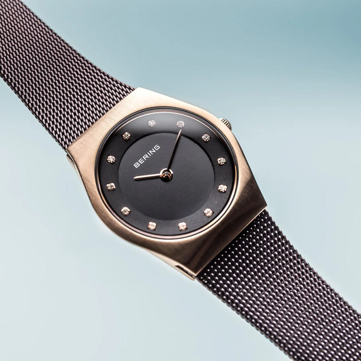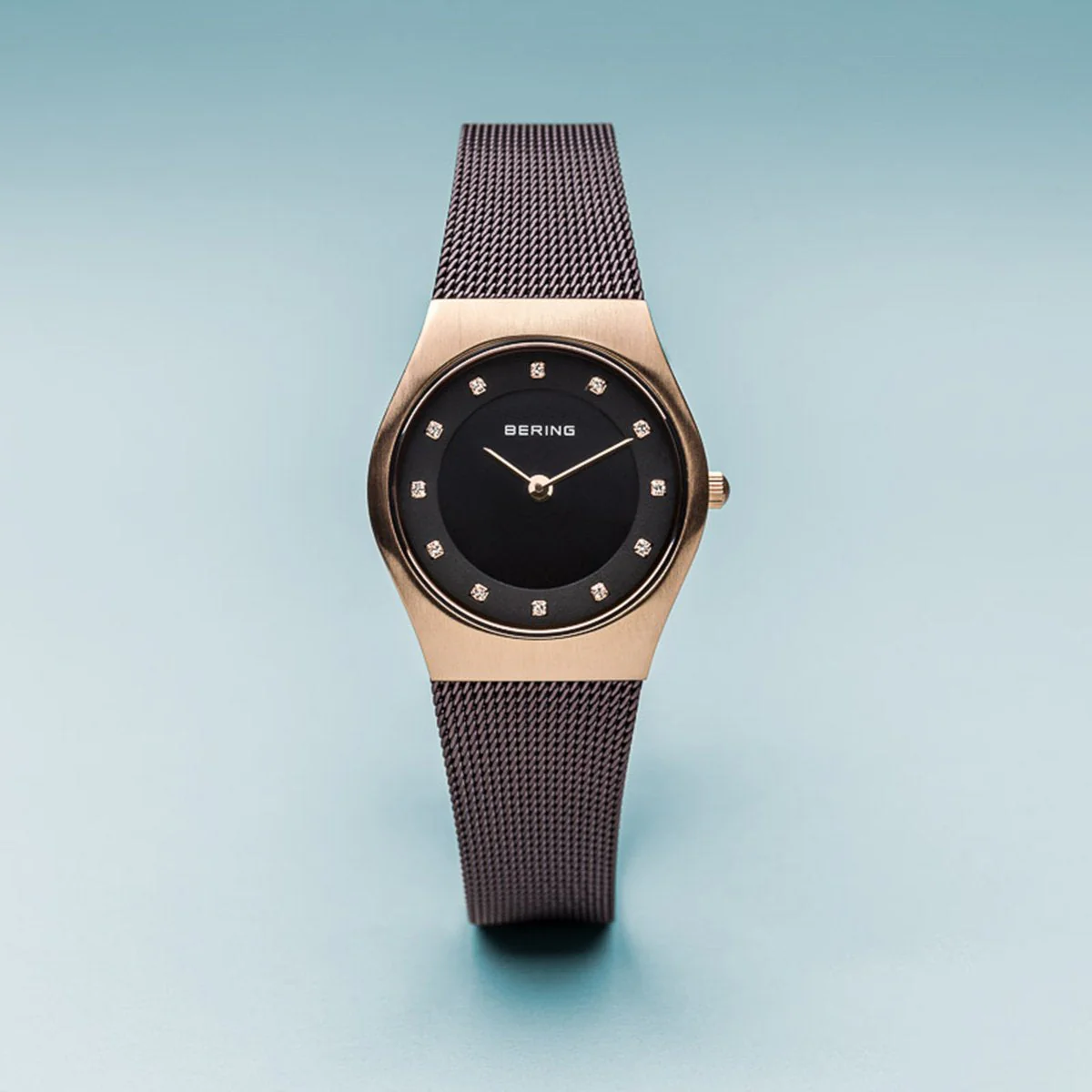The brushed rose gold colored stainless steel case made of pure, high quality, medical-grade stainless steel (316L), in combination with the modern brown colored milanese strap, provides the classic BERING look. The fine workmanship of the milanese strap gives the watch a refined, almost noble touch. A brown colored dial embellished with SWAROVSKI ELEMENTS and protected by crystal clear, scratch-resistant sapphire crystal perfectly completes the classic look.