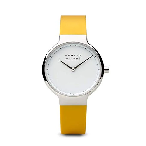 Designed by renowned Danish designer Max René, this Bering women’s watch merges minimalist elegance with functional precision. The polished silver stainless steel case, measuring 31 mm wide and just 7 mm high, frames a clean white dial beneath a flat, scratch-resistant sapphire crystal. A vibrant yellow silicone strap adds a refreshing modern accent while offering comfort and durability. Seamlessly blending refined aesthetics with versatility, this quartz movement timepiece features innovative sliding technology, allowing effortless strap changes to match your evolving style. With 5 ATM water resistance and a subtle pin buckle clasp, it’s ideal for everyday sophistication. A standout in the watches category, this piece captures timeless design with contemporary flair.