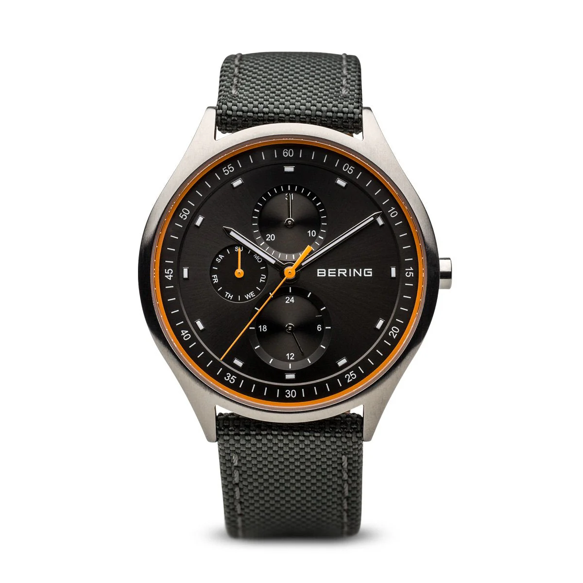 The combination of the grey coloured Sunray dial, the matching multi-function indicators (day/date/24hr time) and the brushed, non-allergenic titanium case makes for a unique timepiece. The watch is protected by an especially hard, crystal clear and scratch-resistant sapphire crystal. Paired with a Simple, elegant nylon band, a linear, modern look is achieved.