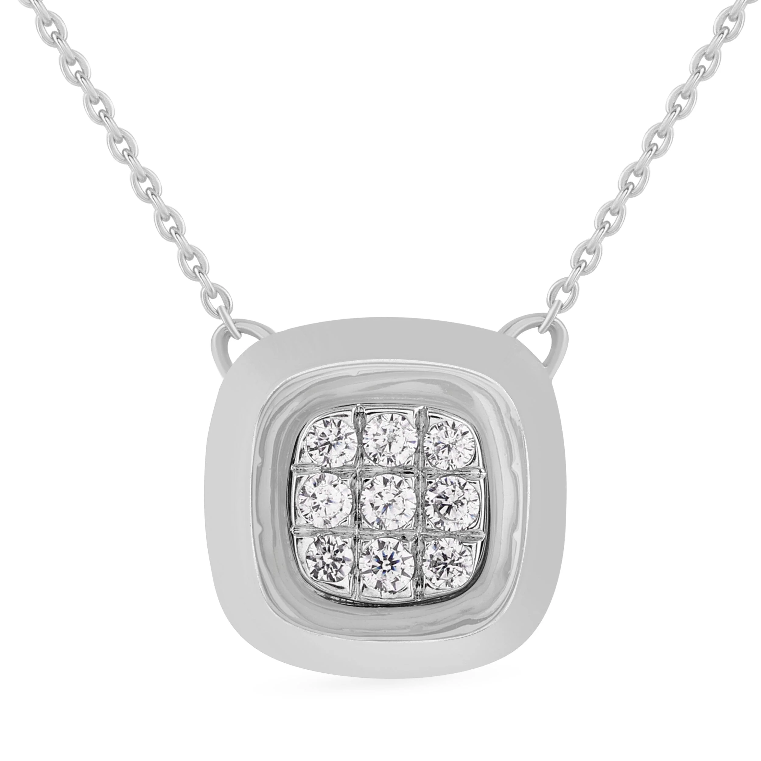 This wonderful Bezel Set Cushion Look Necklace with 0.10ct of Diamonds in Sterling Silver features brilliant claw settings. Elegant and timeless, a diamond pendant necklace can be a subtle accessory, a complementing design piece or a standout showcase designed to embellish your look it all depends on how you tailor your outfit around it.