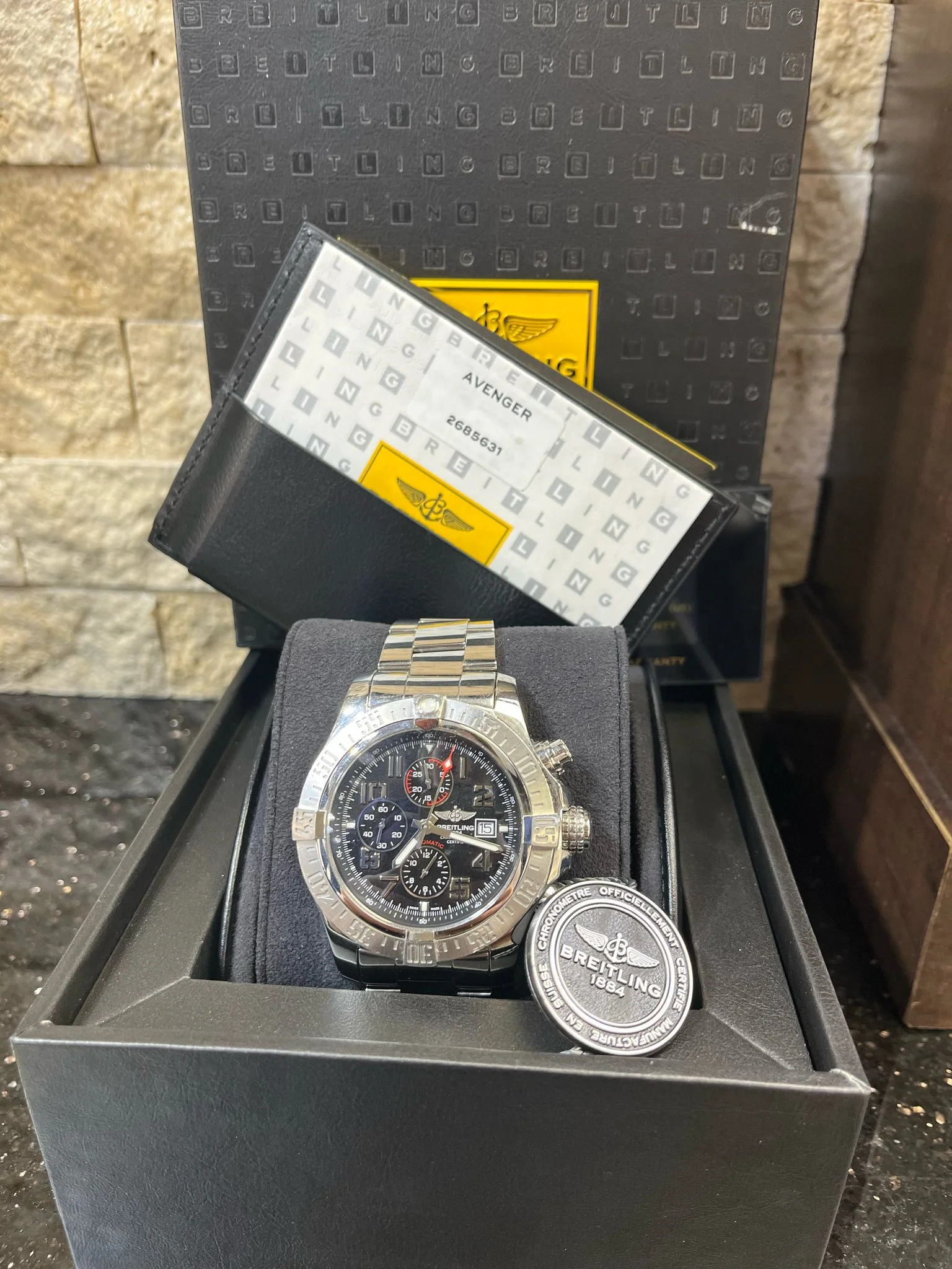Expertly crafted and durable, the Breitling 44MM watch is perfect for the modern man. With its full box and papers, it exudes luxury and reliability. Experience the precision and elegance of this timepiece, backed by the expertise and reputation of Breitling. Increase your style and sophistication with Breitling 44MM.