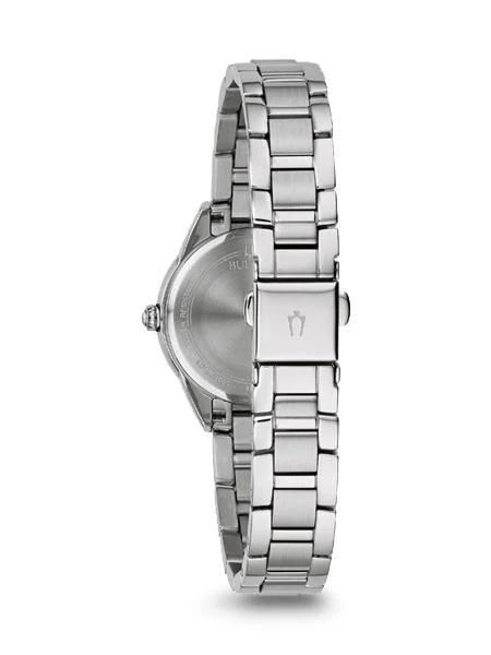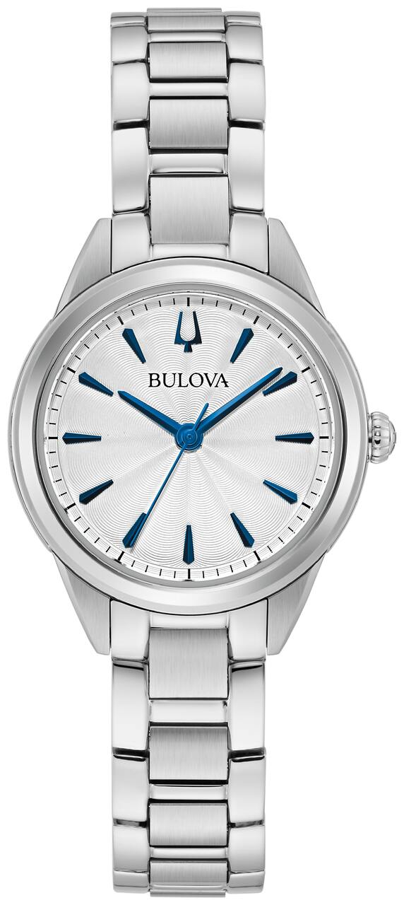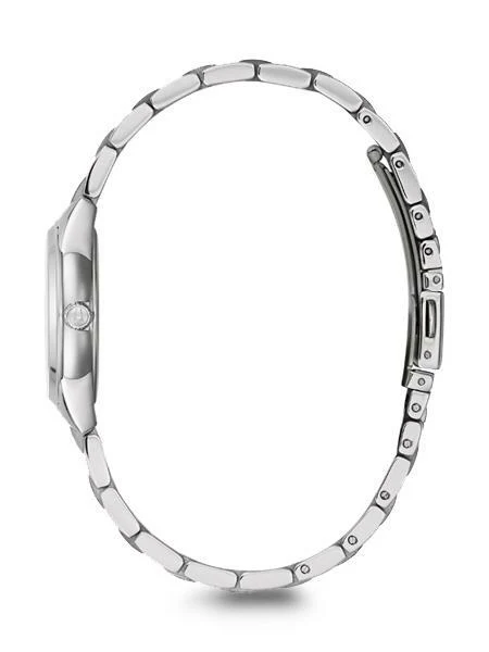 Stand out in sophistication and style with this elegant, classic ladies watch. It has a stainless steel case with a smooth silver-tone finish and a silver dial, flat mineral glass, three-hand Quartz movement, majestic blue hands and dial details, and fold-over closure. This watch will take you effortlessly from day to night and is the perfect addition to your watch collection.
