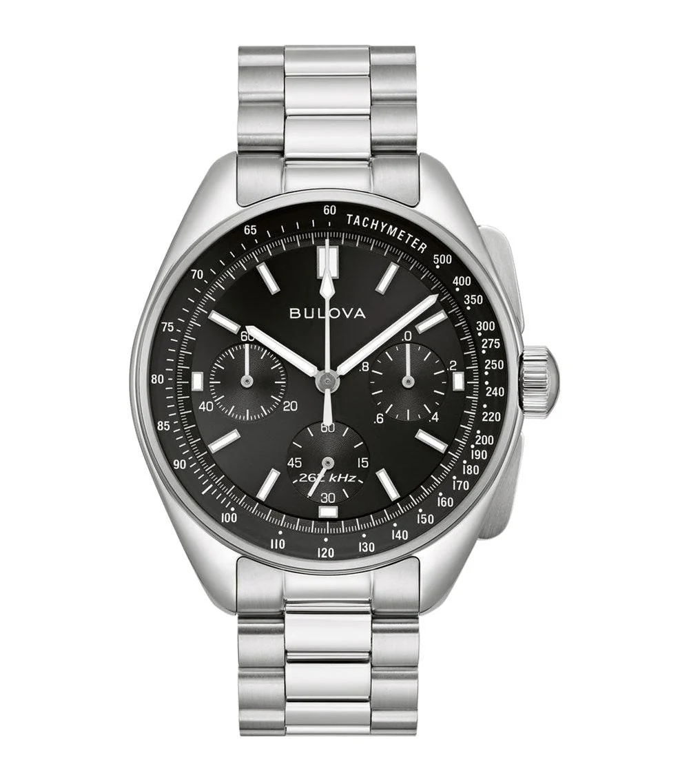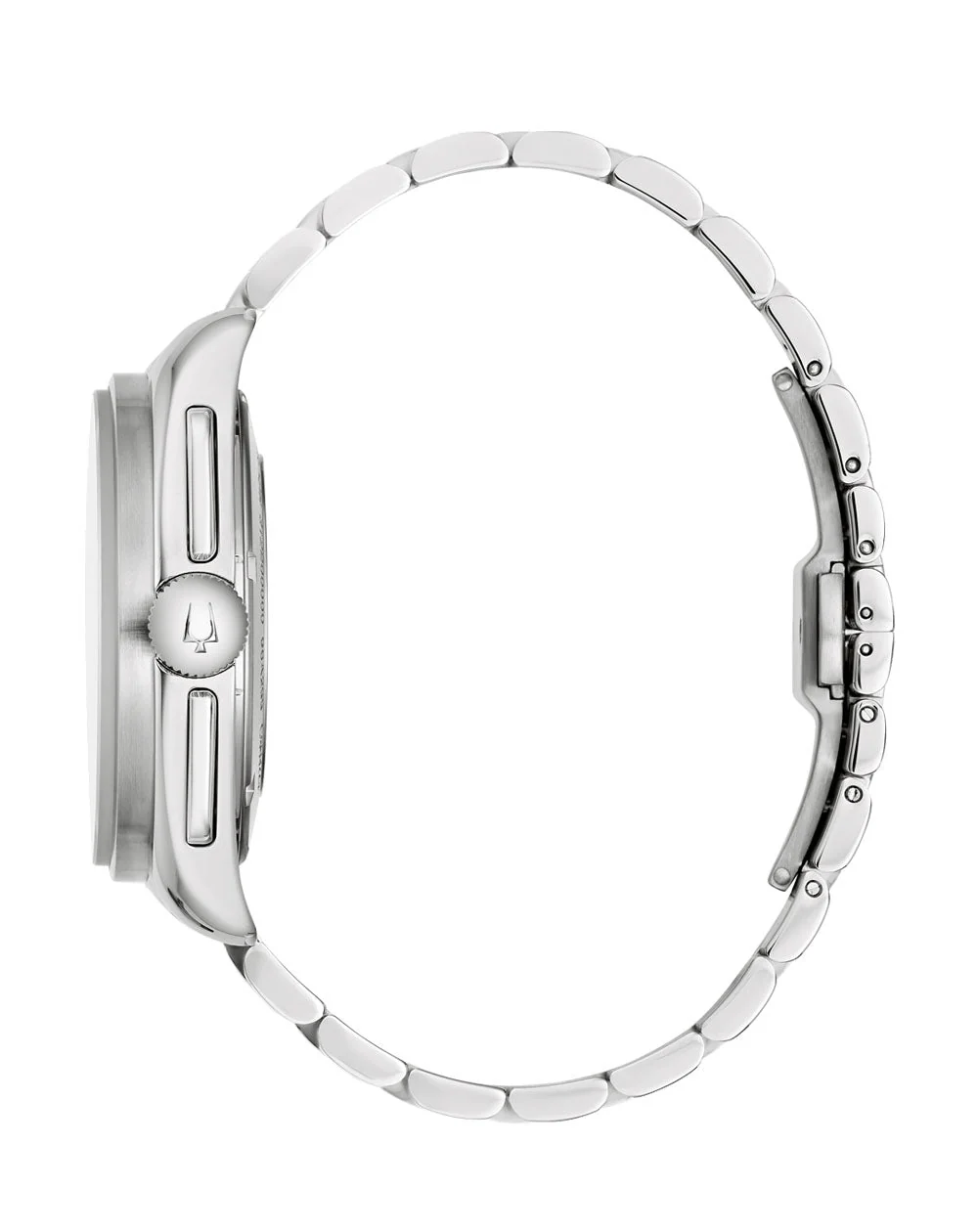 • Superior Craftsmanship: 43.5mm silver-tone stainless steel casing with slim chronograph pushers and a crown adorned with the Bulova tuning fork logo at 3 o’clock.