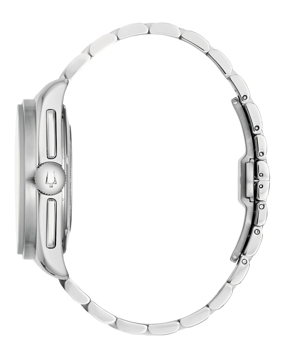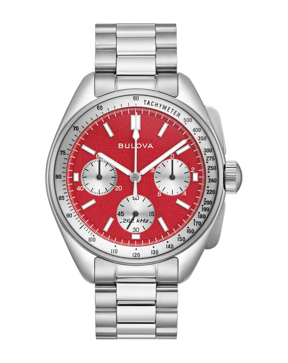 The chronograph’s pushers and crown, adorned with the iconic Bulova tuning fork logo, are intuitively positioned for ease of use. Beneath the flat sapphire crystal, the unique red and silver “panda” dial captivates the eye, reminiscent of the captivating hues of a lunar eclipse. The dial’s vibrant red contrasts beautifully with a silver-white tachymeter ring and a retro Bulova logo, while super-luminous hands and markers ensure legibility in all lighting conditions.