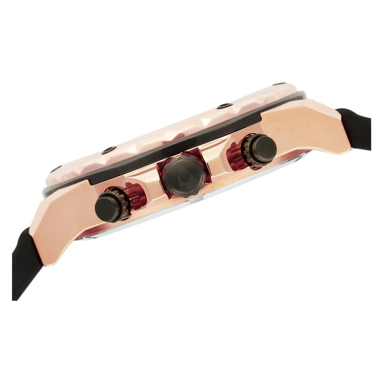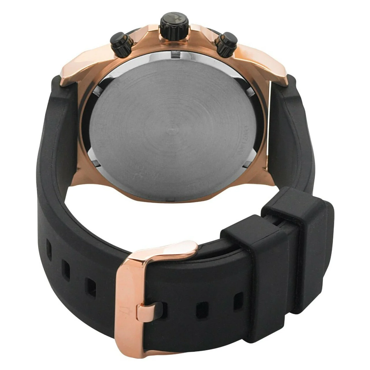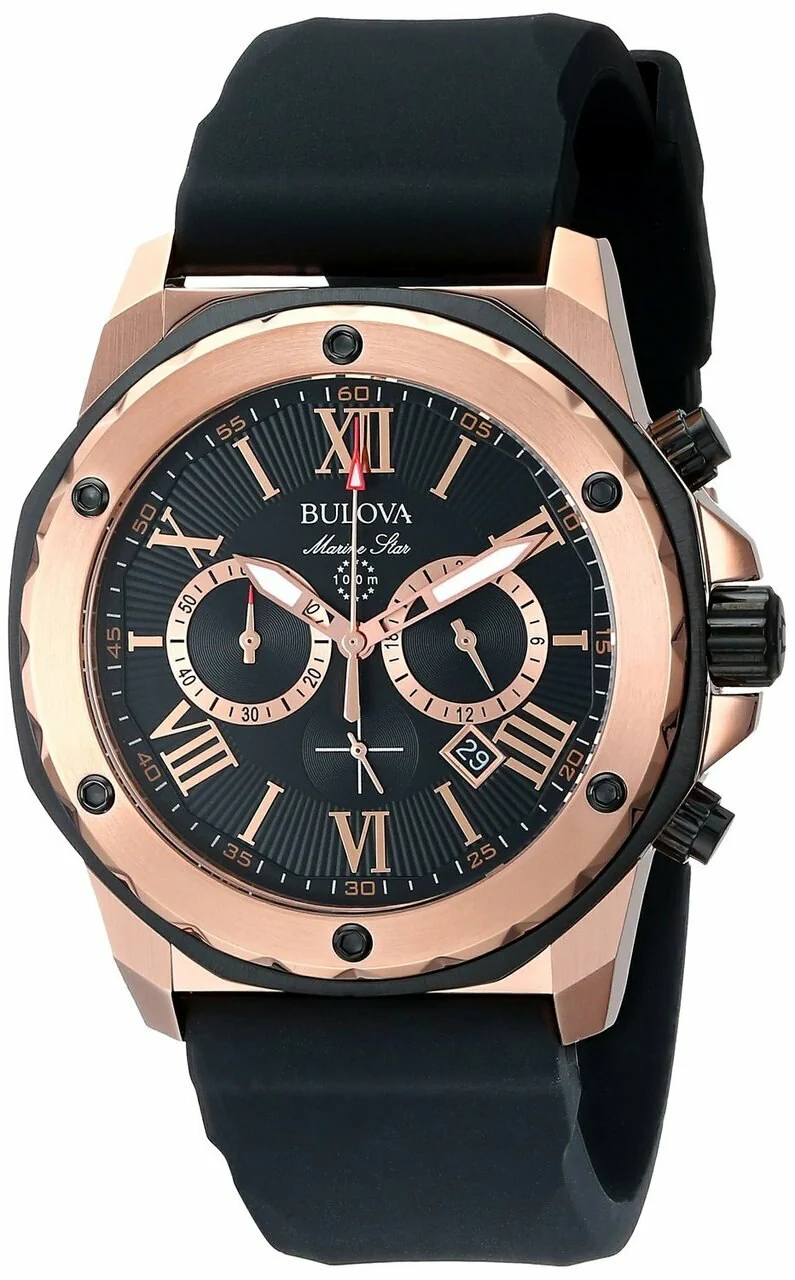 The Bulova Men’s Marine Star Calendar Watch features handsome angles and edges for a sharp look. A water-resistant black rubber band is enhanced by angled edges and joins to a gold-tone stainless steel case with a similar angled design. An octagonal black frame is topped by a gold-tone stainless steel bezel that features black screw-down accents and fashionable side cuts. A black dial displays stick and Arabic numeral minute markers, silver-toned Roman numeral and shape hour indicators, as well as a Bulova logo at the 12 o’clock position. Three subdials, a date window at the four o’clock position, and luminous skeleton hands complete the appeal of this fine timepiece. The Bulova Men’s Marine Star Calendar Watch is water resistant to 330 feet.