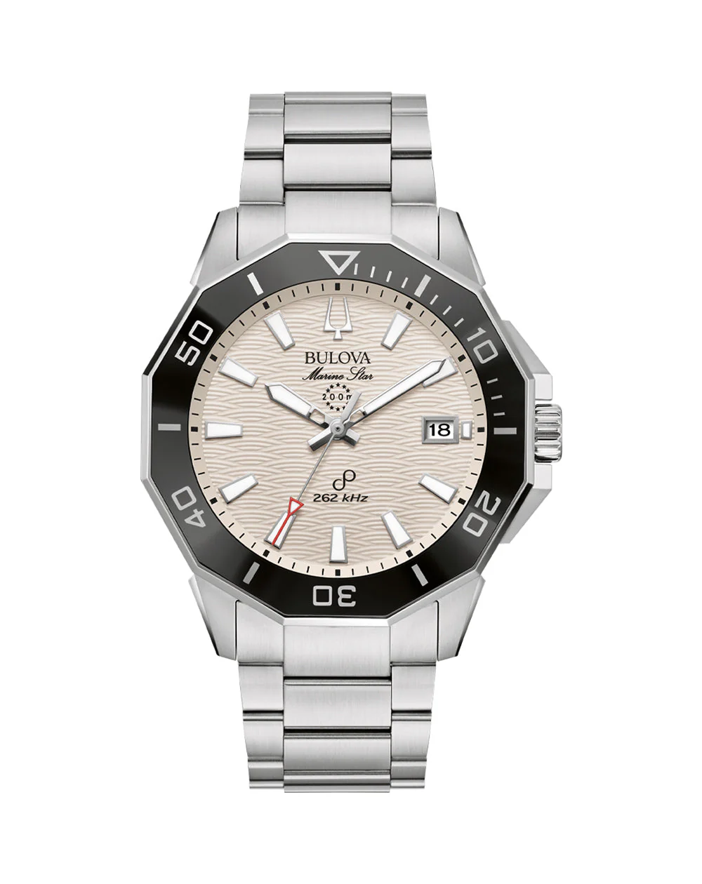 The watch’s bright white dial is a tribute to the ocean’s eternal allure, featuring a wave pattern that captures the eye. It is punctuated by applied hour markers and a distinct handset, all infused with luminescent material to ensure exceptional visibility in any lighting condition. The inclusion of a date window at the 3 o’clock position adds practicality, while the red-tipped seconds hand introduces a subtle yet striking contrast as it glides effortlessly around the dial, powered by Bulova’s groundbreaking Precisionist movement. This proprietary 8-jewel quartz mechanism operates at an unparalleled 262kHz, offering accuracy to within 10 seconds per year and enhanced resistance to temperature fluctuations.