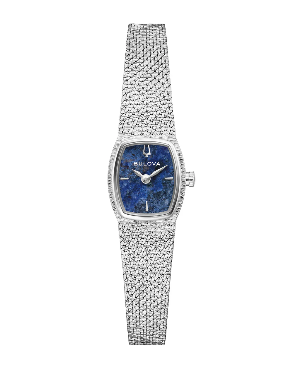 Each variegated genuine blue sodalite stone dial is completely unique and is appointed with silver-tone applied markers and matching hands, while Bulova’s Goddess of Time herself is etched onto the case back in intricate definition. Feel truly divine in this stunning Bulova ladies’ timepiece.
