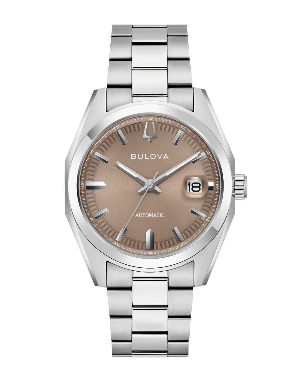 The radiant brown dial has a sunburst finish and silver-tone accents, hands with luminescent fill, cutout minute markers , and a magnified date display. The watch is powered by an automatic movement with 21-jewels and a 42-hour power reserve, showcased through the case back. For those with a discerning eye for refined luxury, this Bulova men’s timepiece is the obvious choice.