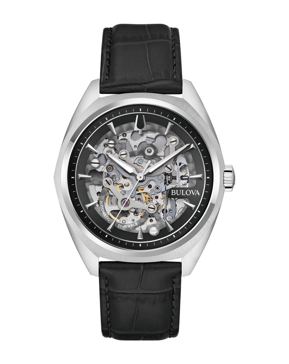 The standout feature of this watch is its mesmerizing dial, which proudly displays the intricate skeletonized automatic 21-jewel movement. This sophisticated mechanism includes a substantial 42-hour power reserve, ensuring reliability alongside its undeniable allure. The dial is encircled by a sleek black chapter ring, featuring applied hour indices that effortlessly draw the eye. The angular hands, filled with luminescent material, provide practical functionality and an elegant touch.