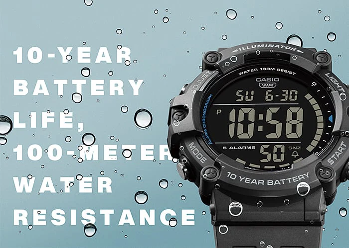 The Casio AE1500WH-1A men’s watch combines rugged durability with advanced functionality in a bold, modern design. Its black resin case and band offer lightweight comfort and resilience, perfectly suited for everyday wear or outdoor pursuits. Featuring a wide digital display and LED backlight, time is always easy to read in any lighting. The watch is water resistant up to 100 meters and powered by a 10-year battery, ensuring long-lasting reliability. With features like dual time, 1/100-second stopwatch, countdown timer, five daily alarms, and a full auto-calendar, this resin band watch delivers precision and convenience. Ideal for those who value utility and style in a striking black dial design.