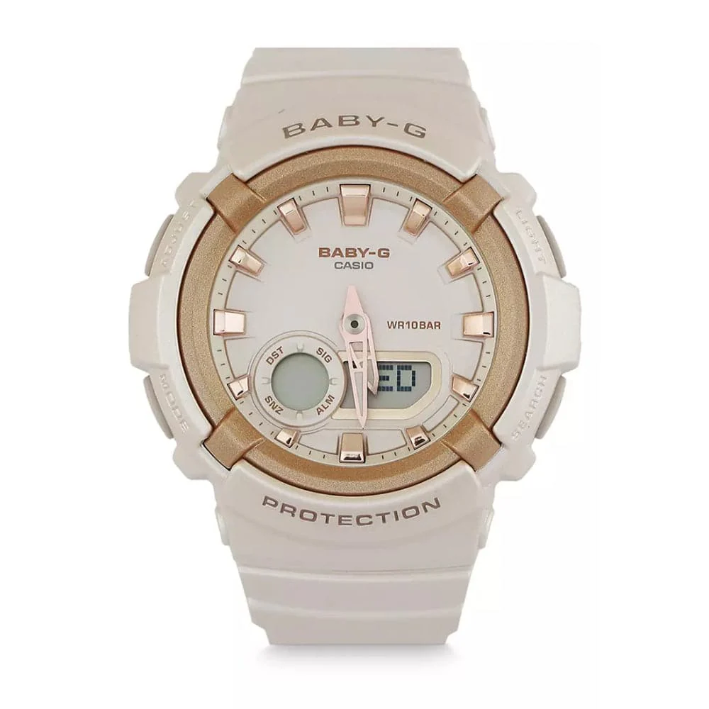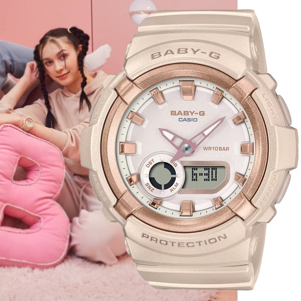 Savor the sophistication of a shock-resistant BABY-G with casual metallic accents to go with your active life.