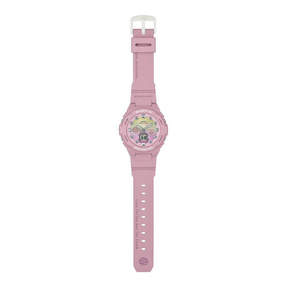 This pink timepiece takes its inspiration from the Acropora nana coral cultivated at the Casio coral field in the sea off Ishigaki Island in Okinawa, Japan. Evoking this underwater marvel, the dial features a gradation of pink and yellow, with a whitetail dascyllus, a fish that lives among the coral, at the 4 o’clock index mark. The band features the Aqua Planet logo and the slogan “Love the Sea and the Earth,” while the case back is engraved with the “Love the Sea and the Earth” mark.