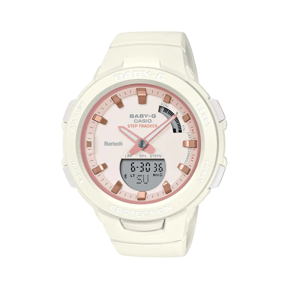 Sync with your smartphone via Bluetooth® for effortless watch operation. Simply tap on the BABY-G Connected app to easily manage your daily activity logs and exercise settings from your phone. Calculate calories, set step goals, and even create and transfer timer menus, log steps with 5 exercise intensity levels, store stopwatch measurements, and view all calendar data.