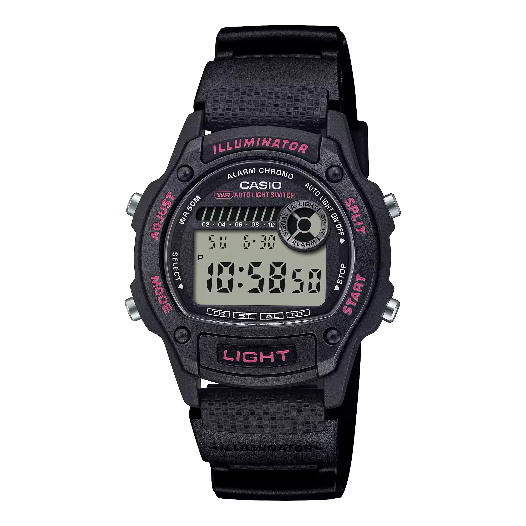 Designed by Casio with practical elegance in mind, this mid-sized men’s watch features a 36.6 mm resin case that fits comfortably on slimmer wrists. The black rubber-like bio-based resin band is both durable and lightweight, accented with a subtle touch of pink for a distinctive look. Its digital display offers essential functions including world time, 12/24 hour format, alarm, day-date display, and a front-facing LED light for easy readability in low light. With 100-meter water resistance and quartz movement, this sporty yet refined timepiece seamlessly blends utility and style.