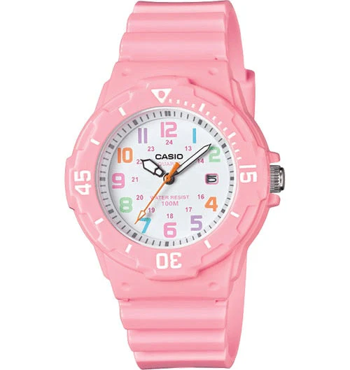 Simple and compact, these dive inspired ladies 3-hand analog timepieces feature 100M water resistance, a bi-directional rotating bezel and date display. Gloss light pink resin band analog watch with multi-colored accented face.