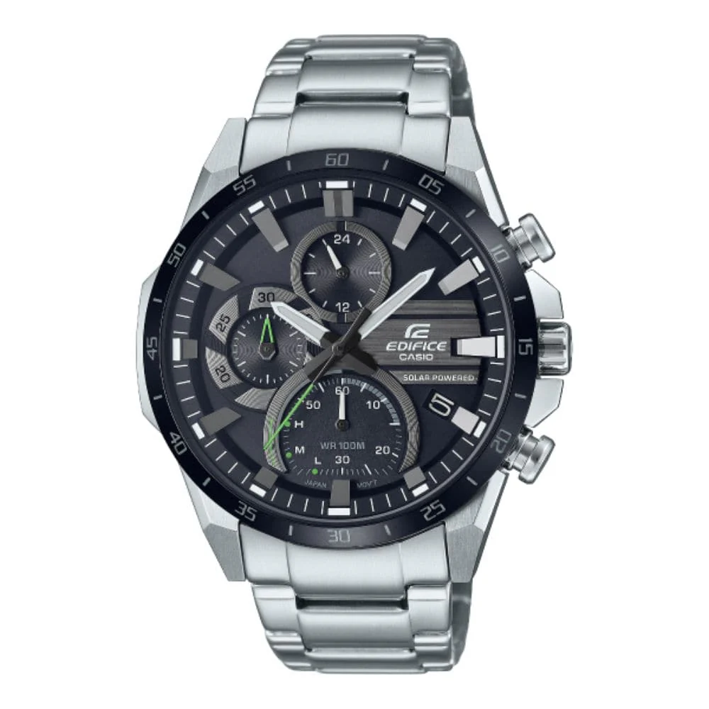 The EQS-940DB solar-powered chronograph features striking inset dials in a watch face designed with depth and dimension. Thick, sharp index markings add bold accents that make a powerful statement. The second hand is marked in eye-catching fluorescent green for motorsports fans who truly appreciate speed.