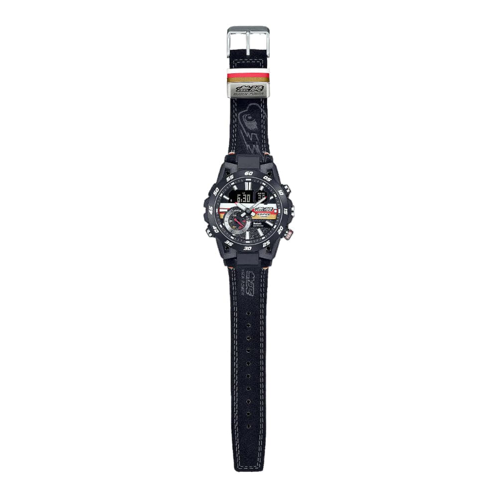 The EDIFICE MUGEN EDITION embodies the identity of the world-renowned MUGEN brand, developer and manufacturer of racing engines and aftermarket parts for Honda cars. The MUGEN logo and four brand colors — white, red, gold, and black —are featured on the dial, the band and band loop. The band is made of soft, durable Alcantara material and stamped with the iconic MUGEN symbol, the “Eye Commander.” Even the minute display on the bezel features a font provided by MUGEN.