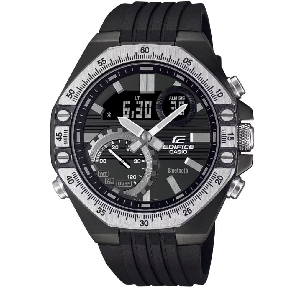 Fine-tune your power and precision with a bold, intricate design inspired by professional automotive instruments. Special high-performance motorsports watch, the EDIFICE ECB-10TP, boasts the solid sophistication and fine detailing of an auto lover’s toolkit.